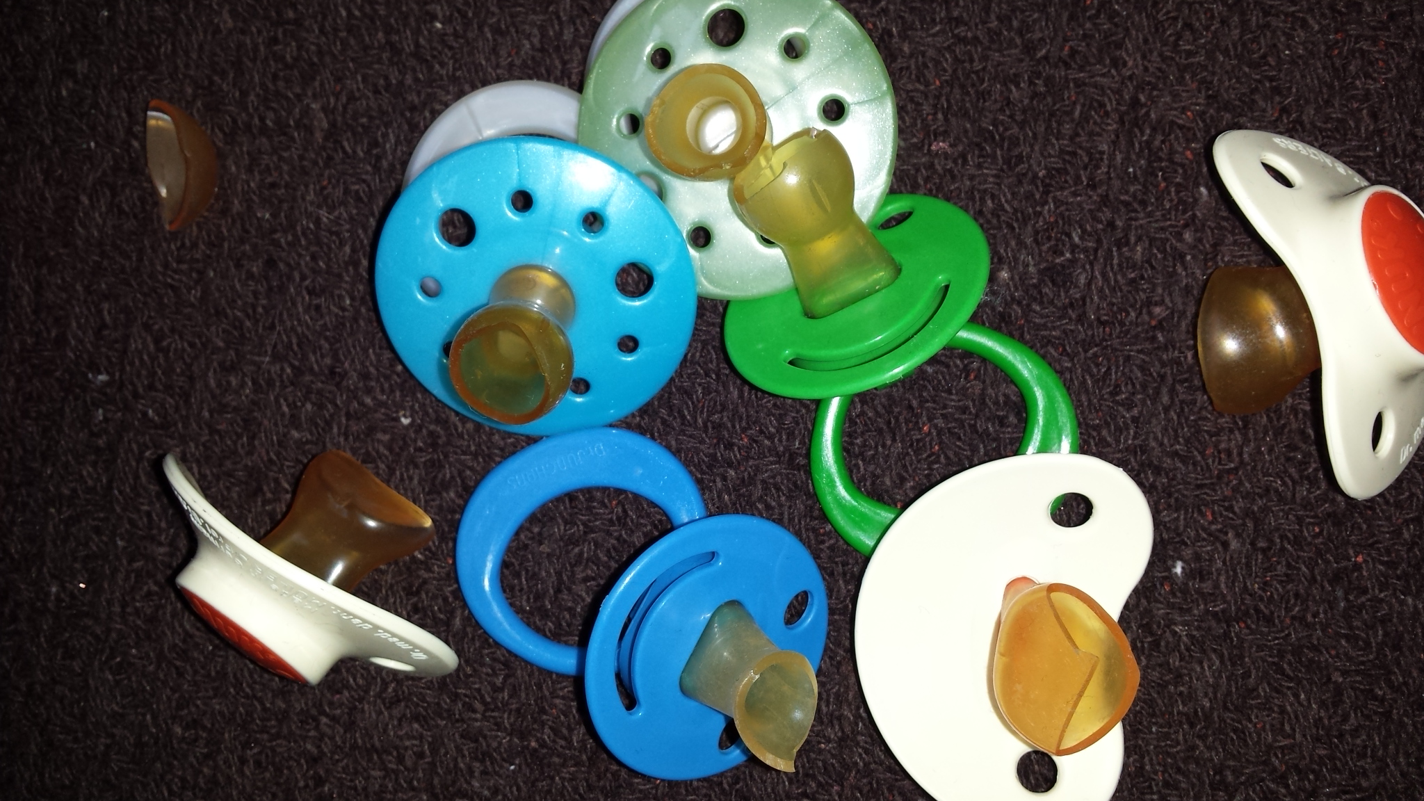 Ich habe momentan um die 40 Schnullis, ich habe alle auf den Boden gelegt und ich lege mich dann gerne auf meinen Gymnastikball und rolle über die Schnullis. Aufeinmal knackt es laut und ich habe gedacht ich habe einen Nucki gecrusht, als ich dann runterrollte verlor mein Lieblingsball Luft... der Übeltäter hat meinen Ball zerstört. Ich bin mit dem Nucki in den Keller und nun ja, er ist der Axt zum Opfer gefallen. Bilder folgen!