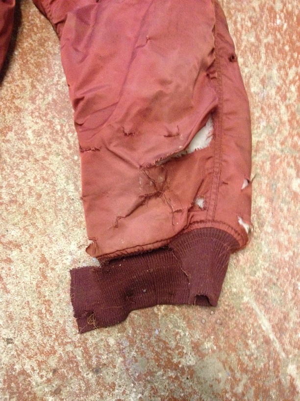 Rote Bomberjacke nach 3 Jahren im Wald zurückgeholt. Leider von MÄusen zerfressen und schwer von der Sonne ausgebleicht aber noch alles dran