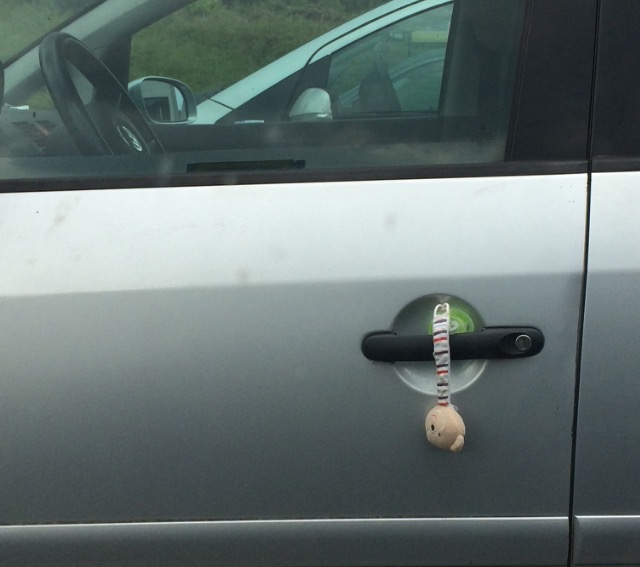Ich hab den Schnuller bei einem E Center einer Frau ans Auto gehängt