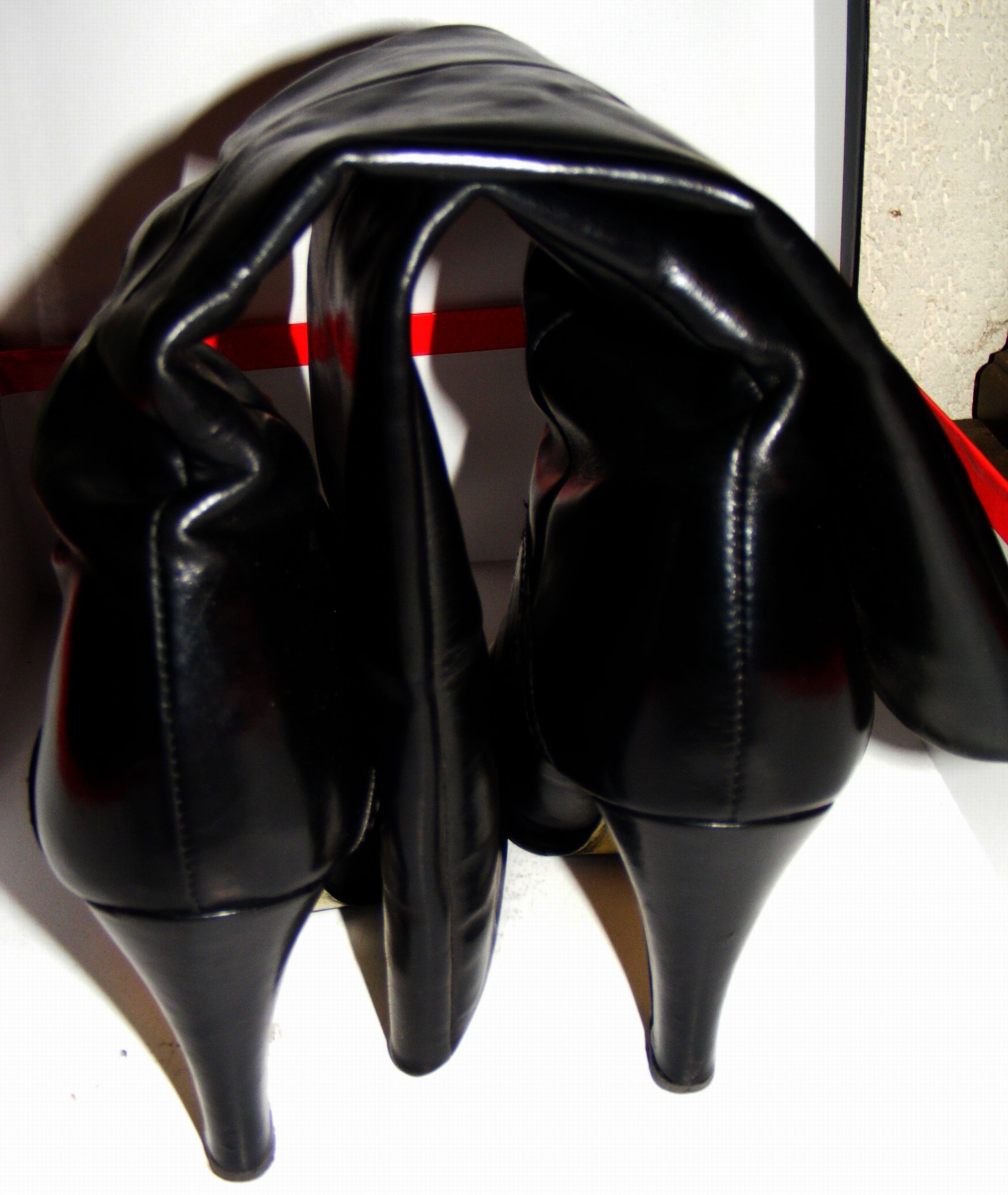 Die Schäfte "seilen" sich regelrecht an den Nylons bis auf die Hälfte ihrer eigentlichen Länge ab und bilden einladend sexy Faltenwürfe. Das ist vermutlich bereits von Zara so beabsichtigt, denn in den Schäften sind oben Halteschlaufen für Federbänder eingearbeitet, damit man die Stiefel entweder faltig oder auch in voller Länge Tragen kann.