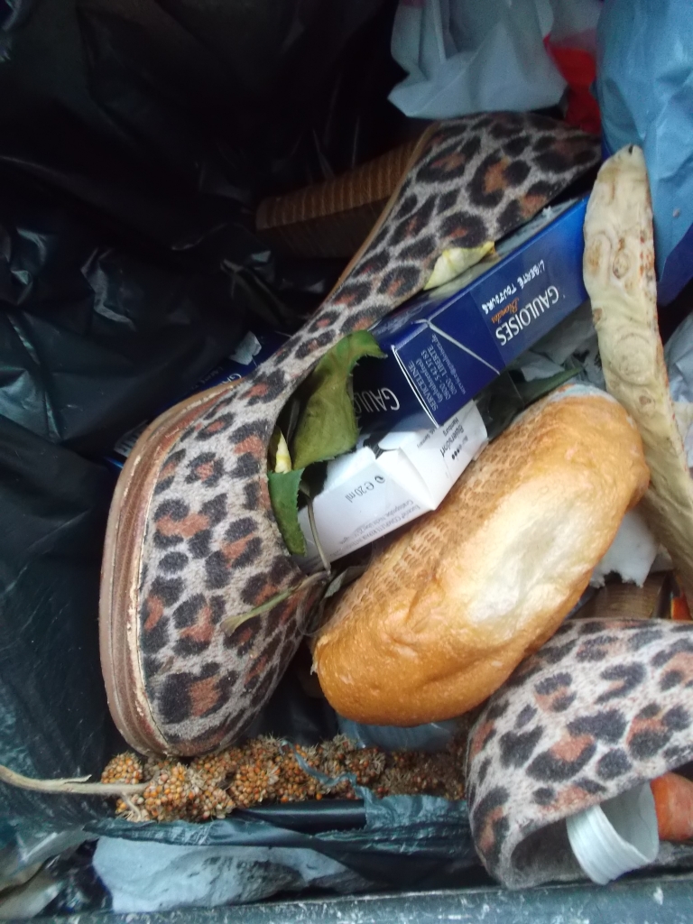 ich tastete also das schwarze ding, war leider was hartes aus plastik, ne duschgelflasche oder so, aber das schwarze daneben war weich und hatte auch die passende form, im ersten moment dachte ich, pumps? also riss ich vorsichtig die tüte auf und hatte einen zerlatschen ballerina meiner nachbarin in der hand, in grösse 36, ich griff dann also noch etwas tiefer und hatte den zweiten in der hand, zum glück war der müll relativ sauber, vielleicht badezimmer und keine eckligen essensreste, also müllgestank gleich null und wie man sieht, war es höchste zeit, dass die zerlatschten kaputten dinger im müll landen, ich wohn übrigens in nem mehrfamilenhaus, da waren schon öfter schuhe im müll, aber bisher nichts, was mich interessiert hätte