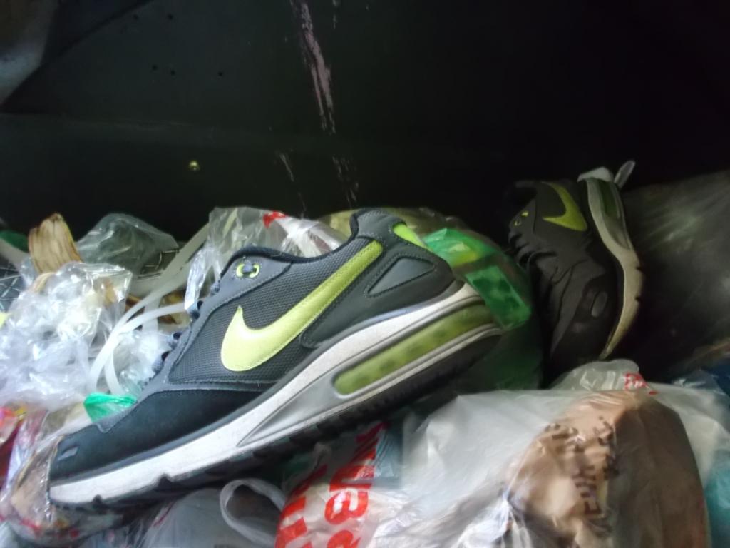 bei dieser Gelegenheit habe ich mal die Kaltblütigkeit besessen zu warten und zu dokumentieren, wie geile Kultsneaks herzlos von den Mitbewohnern mit ihrem Müll verschüttet wurden; keine Rettung, nichtmal ein kurzes Herausnehmen und Prüfen. Für die vielen Mitbewohner waren die beiden Sneakerpaare genau so "Igitt" bzw. "wertlos" wie eine faule Bananenschale oder abgenagte Knochen. Entsprechend auch diese nun folgende Vermüllung: