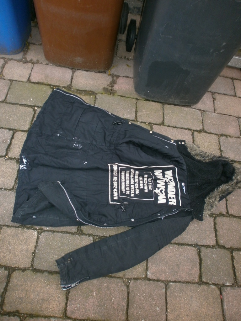 ihr müsst tapfer sein, aber es war doch zu erwarten: Unsere Mülltonne kennt nur wenig bis gar kein Erbarmen: Für Tamaras geil nach ihr duftenden Jacke mit ein paar Farbflecken ist nun auch die Mülltonne "zuständig": Eigentlich schade drum, denn am Tonnenboden liegend, könnte Tamaras Jacke den ganzen Müllsiff von zwei Wochen gut aufsaugen
