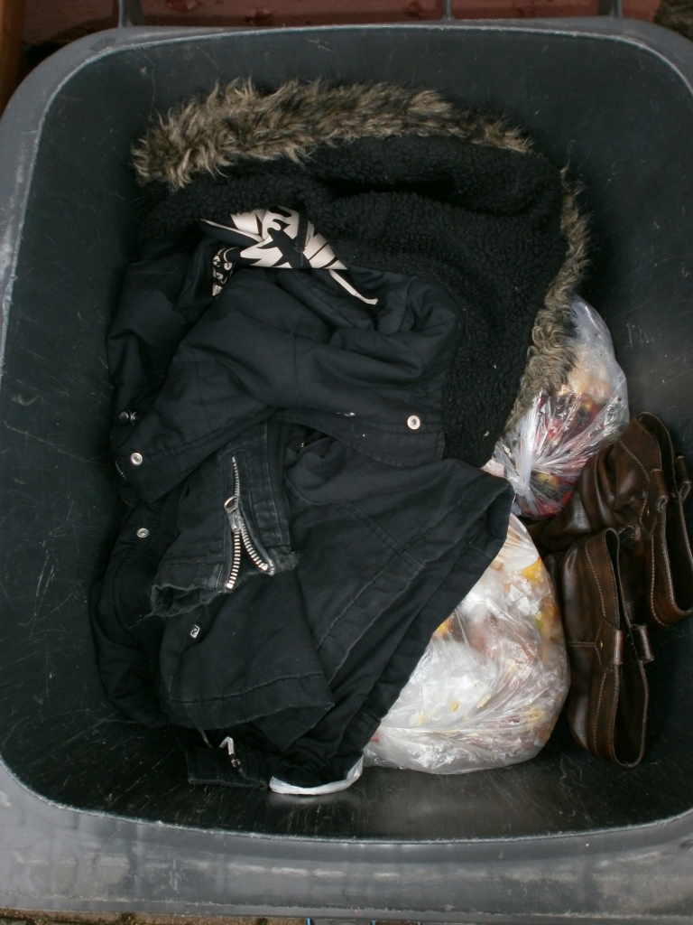 morgen früh ist Müllabfuhr und seit Samstagabend liegt schon wieder weitere Müllbeutel in unserer Tonne. Darunter auch die Sneakers von Lenas Sohn. Martinas Jeans, die "ordentlichen" Stiefel von ihrer Freundin und Tamaras Jacke sind schon ziemlich tief in den Dreck gesackt: