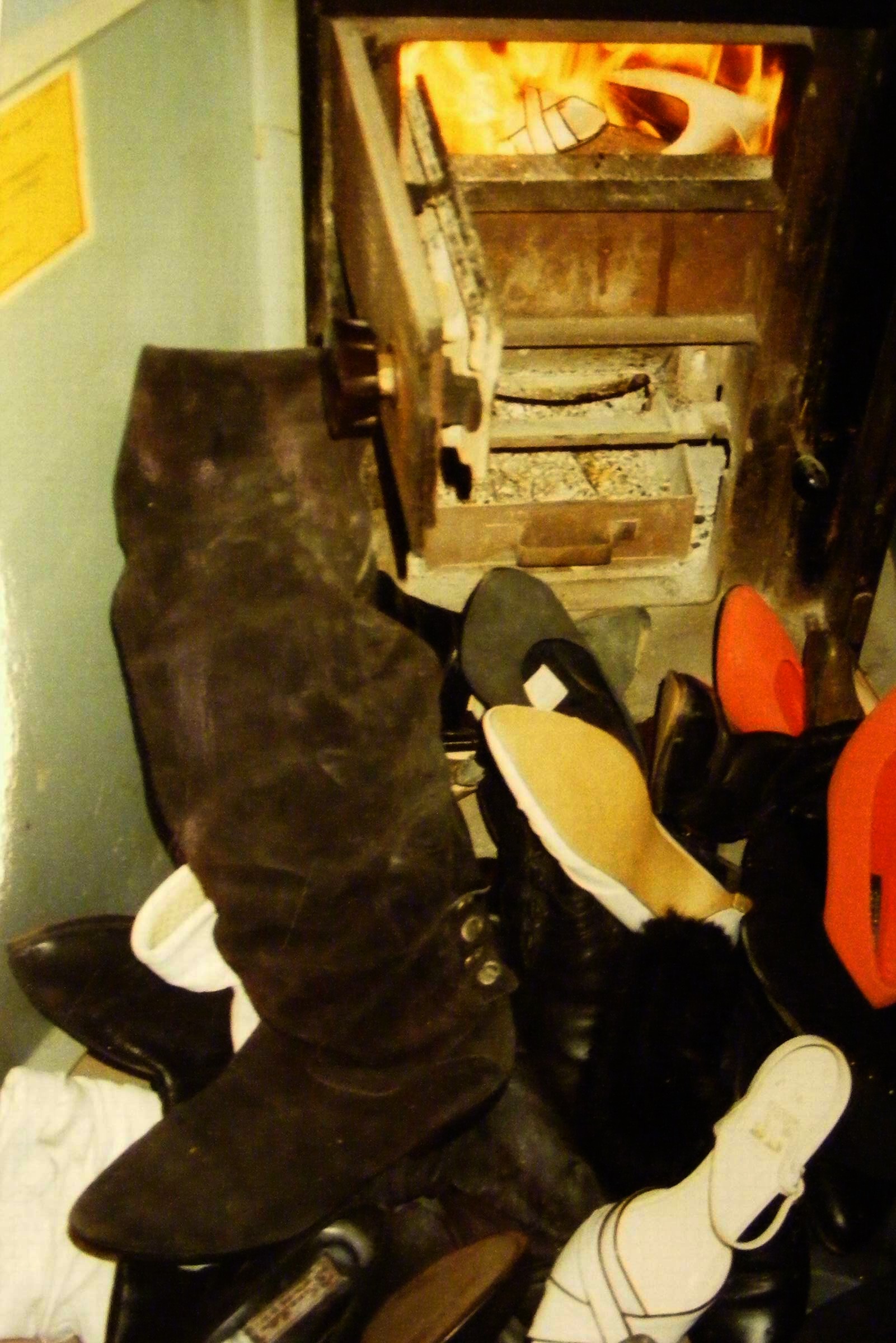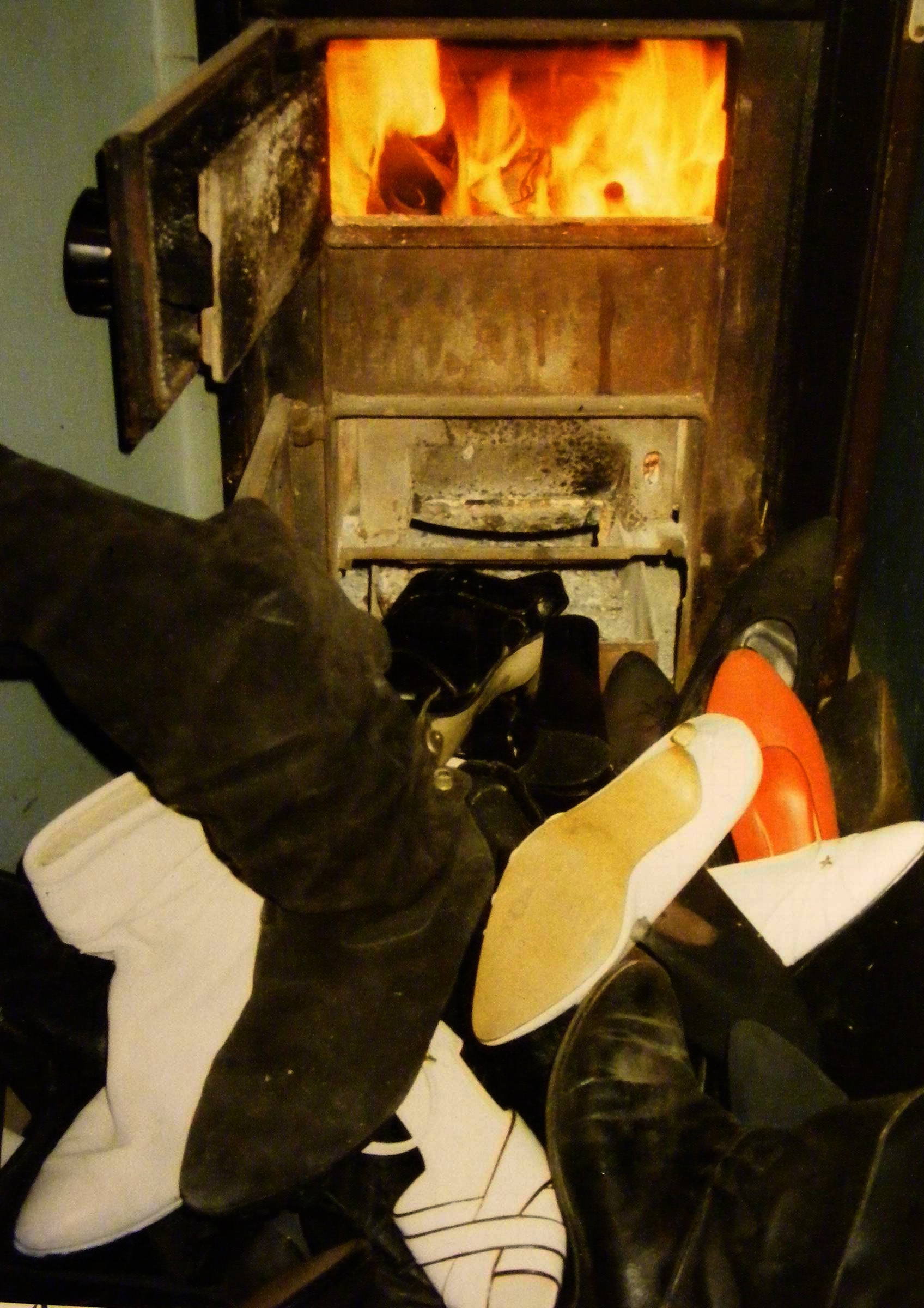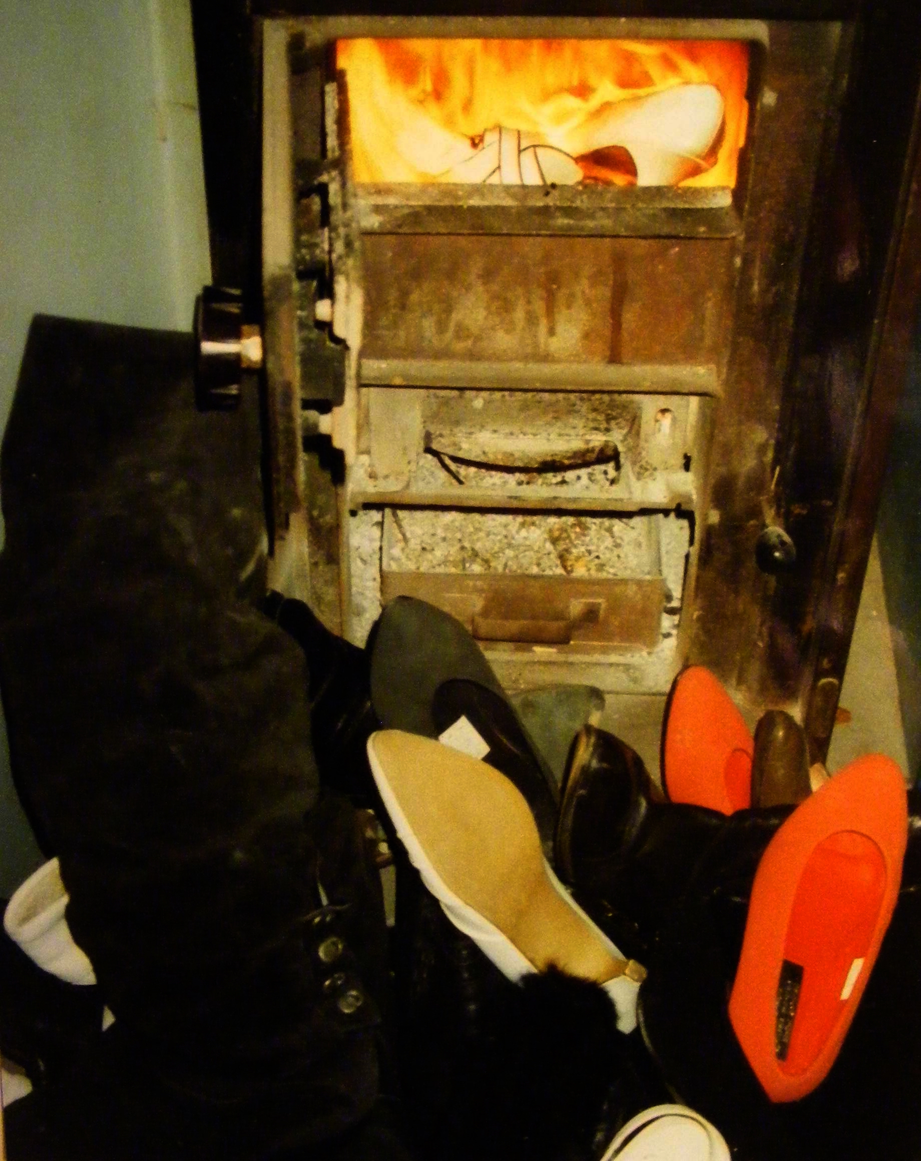 Ich weiß es nicht mehr ganz genau, aber ich glaube, die letzten Trageschuhe lagen ganz oben auf dem Haufen und kamen somit als Erstes in den Ofen. Wir haben von dem Zustand und den Umbauten im Haus seinerzeit viele Fotos gemacht, aber eben noch mit "Film" und zwischenzeitlich hatte ich dann auch einmal schnell einige Bilder von dem bereits geschrumpften Schuhberg und einigen Teilen im Feuer gemacht.