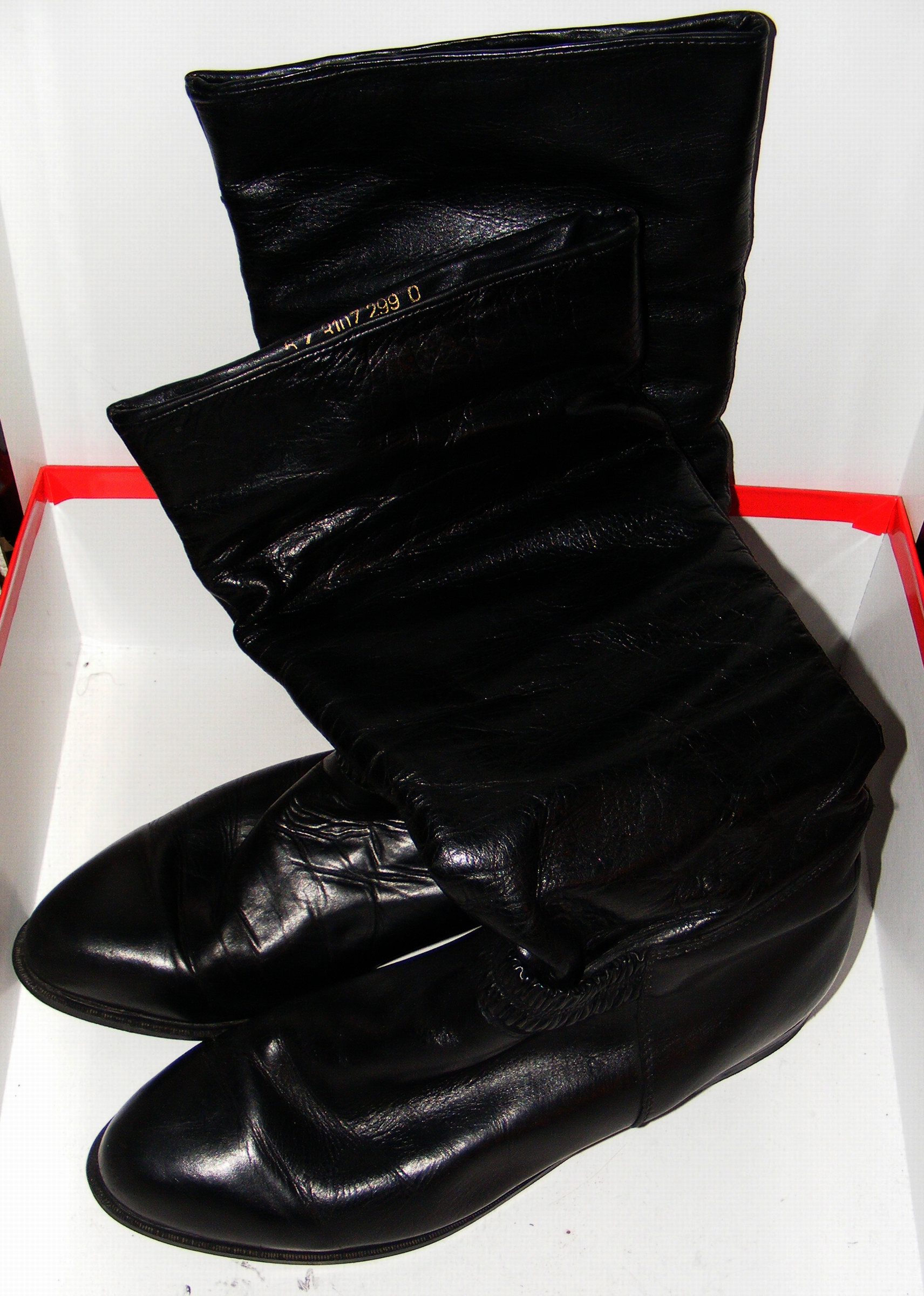 Im Januar 2001 habe ich so etwa 300 Paar Schuhe/Stiefel ausgemustert, in Säcke verpackt und in den Keller verbracht. Am 03.-04.02.2001 habe ich Alle (einschließlich der Jeansstiefel) dann im Heizungsofen verfeuert. Von solch einem Schuhhaufen vor dem Ofen hatte ich ja schon Bilder gezeigt, aber von den Jeansstiefeln selbst habe ich (wissentlich) keine Fotos mehr.