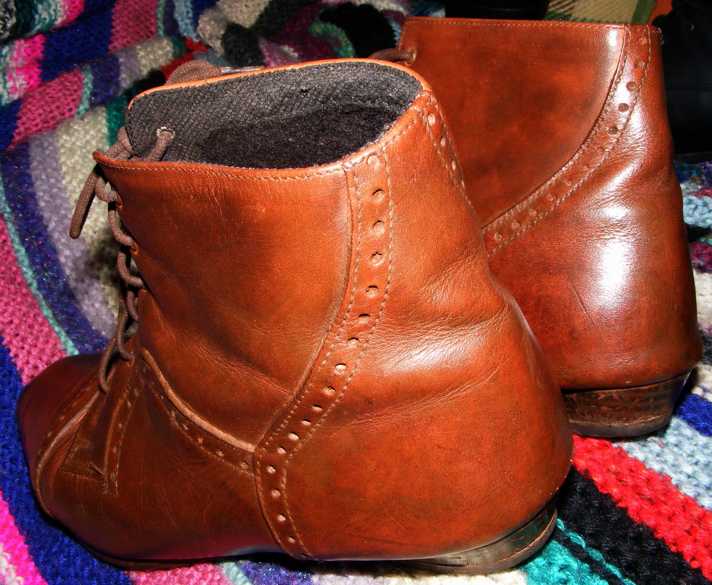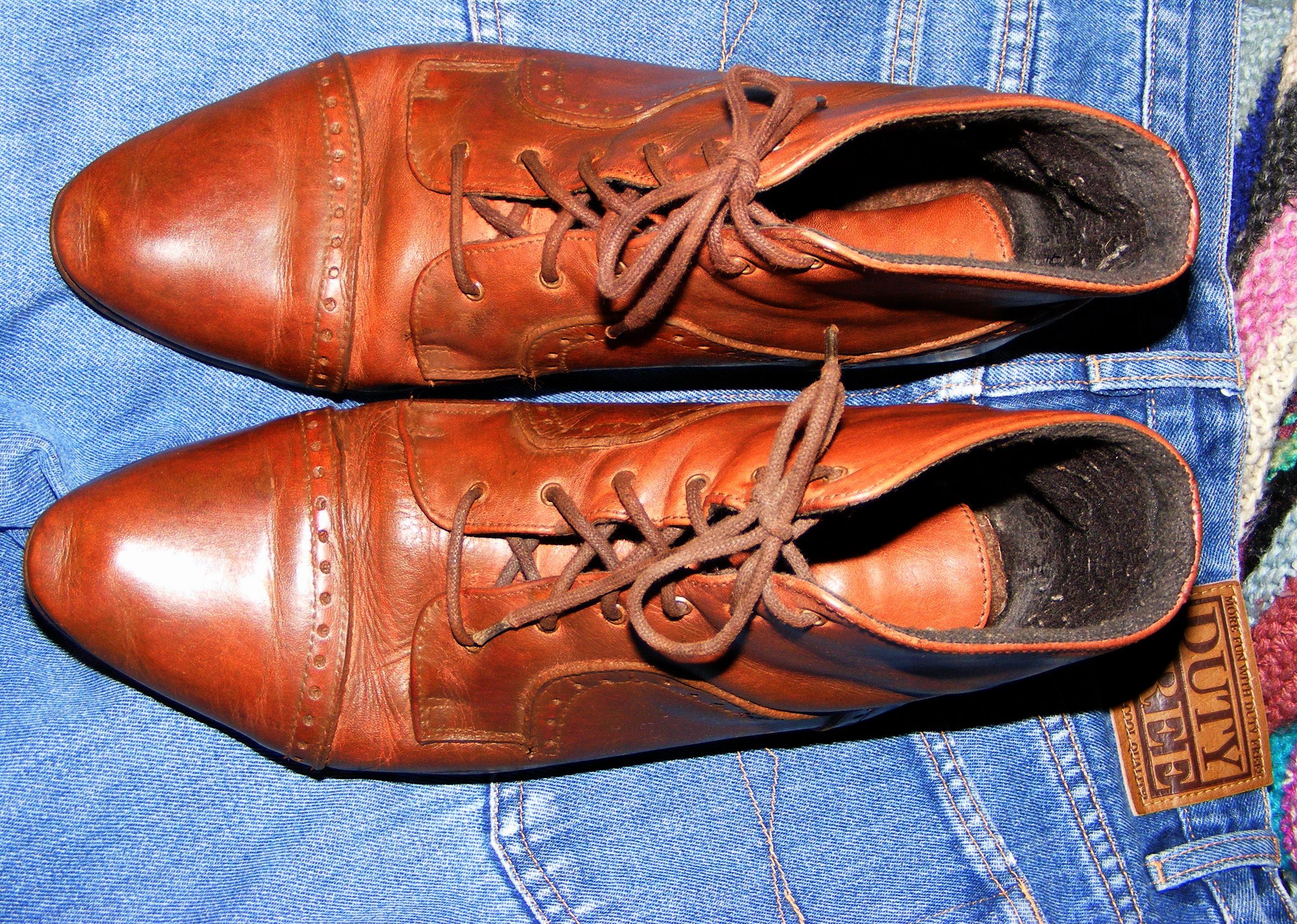 Da will ich doch auch mal den anderen Mädels hier einen Gefallen tun und mal meine fast endfertigen braunen Schühchen Päsentieren. Auch diese Sperrmüllis lagen nach ihrem Auffinden 1998 gleich vor dem Badeofen, beinahe hoffnungslos erschien mir ihr Zustand, total verkratzt und entfärbt, die Absätze schrecklich hin, die Schnürsenkel nur noch Fasern - bis ich in der Hitze und des Flammenscheins ihrer bereits brennenden "Schwesternpaare" aus der gleichen Quelle die übliche "letzte Anprobe" vor dem Verfeuern machte und sie daraufhin erst einmal beiseite stellte. Mit unbeschreiblichen Aufwand restauriert, trug ich sie als anti-modischen Protest in der "Plateauschuhzeit" 1998/99! :P
