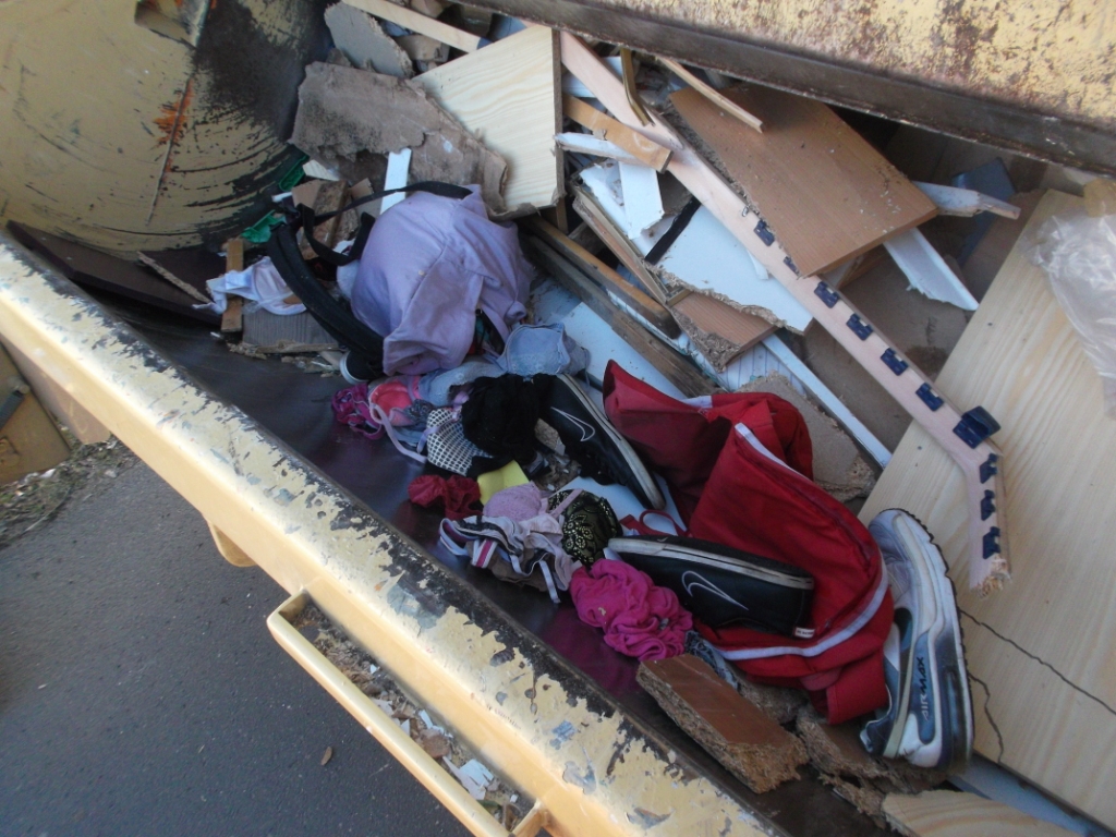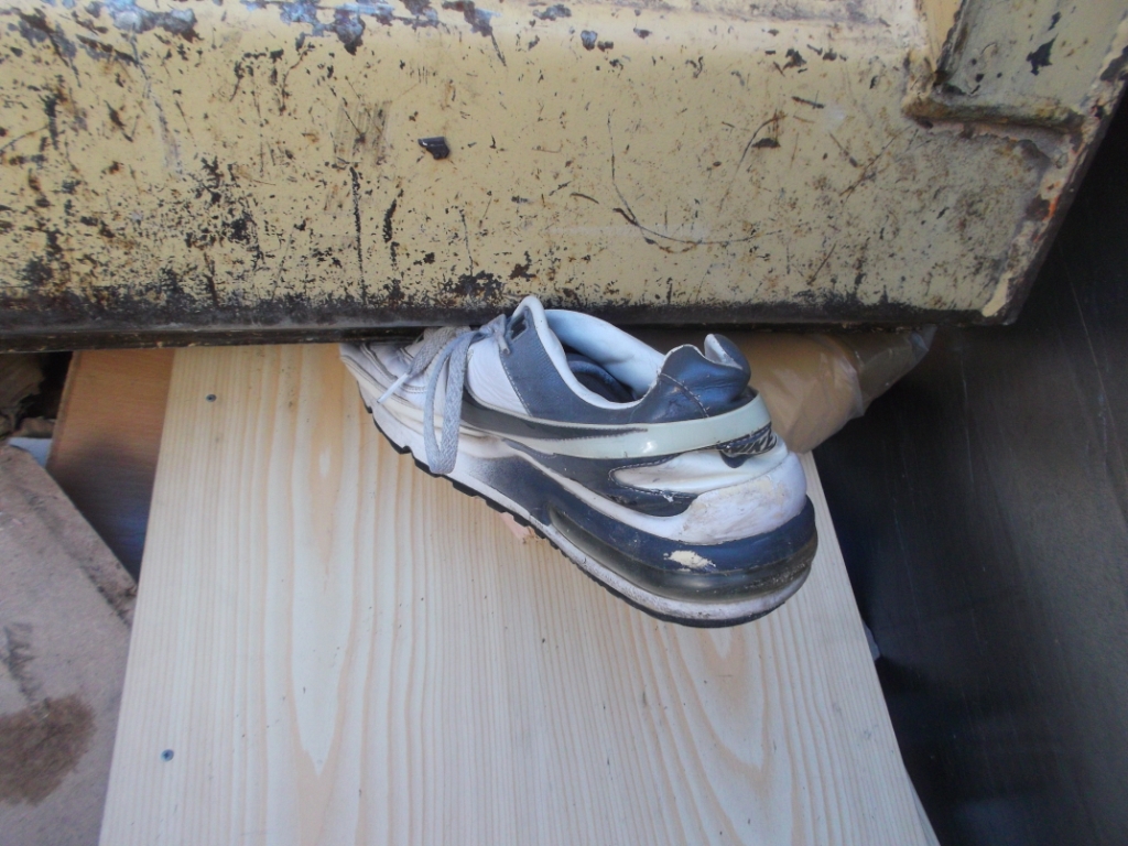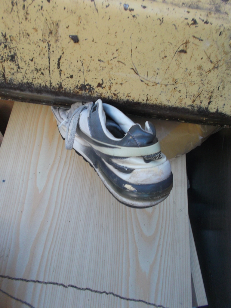 - Ein wirklich spektakuläres und sehr seltenes Bild: Ein Sneaker schon total platt und recht tief drin in den "Bauch" des Müllautos reingepresst! Etwa mit solch "beengtem Platzangebot" müssen Sperrmüllschuhe dann die "Große Stadtrundfahrt" mit "Orange Tours" mitmachen bis sie auf der Kreismülldeponie wieder "aussteigen" können. Hihi!