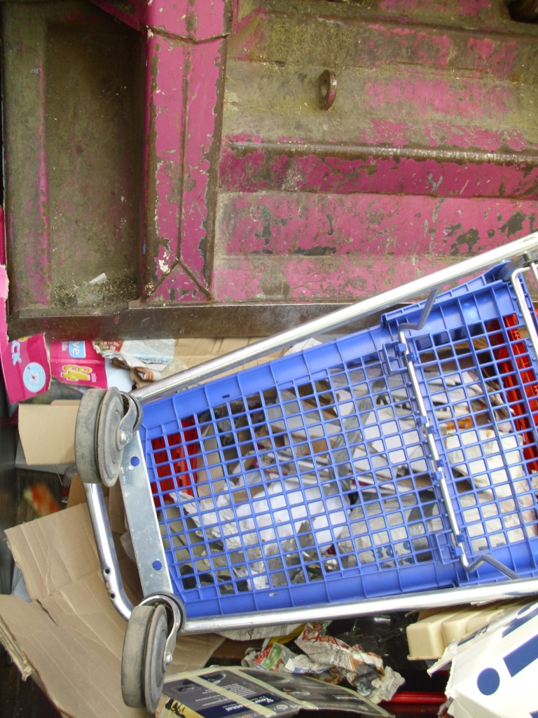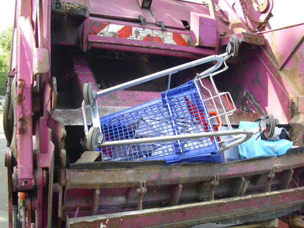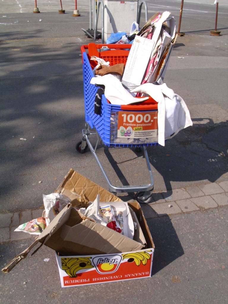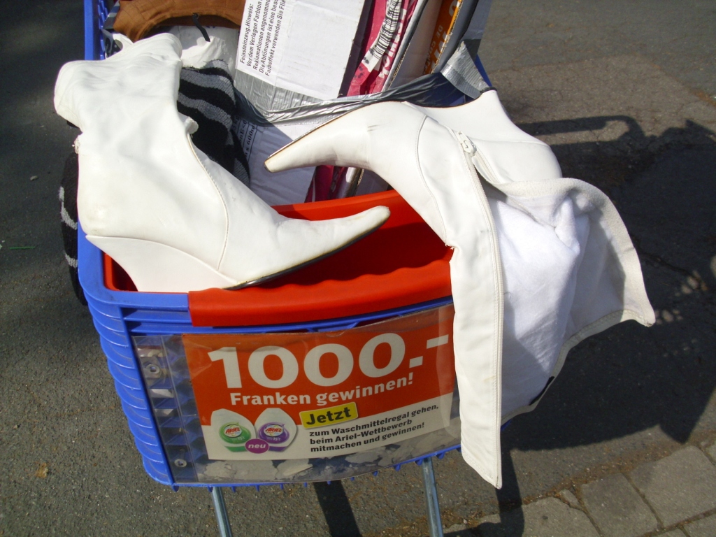 im letzten Jahr habe ich ein interessantes Erlebnis gehabt: Nach einem Markt kam ein Pressmüllauto und räumte den Dreck weg, neben Sperrmüllhaufen entdeckte ich diesen neuwertigen schönen Einkaufswagen und die Werbung verwunderte mich: Ein schweizer Einkaufswagen war mit Abfällen gefüllt worden. Die weißen spitzen Keilabsatzstiefel warteten offensichtlich auf die Müllabfuhr, aber was sollte nur mit dem hochwertigen Einkaufswagen passieren?