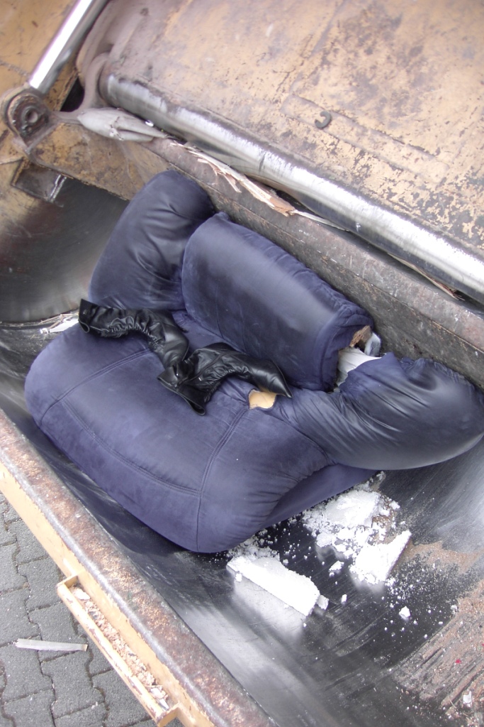 Habe letzten Donnerstag beim Sperrmüll zusehen können. Leider nur kurz, aber die hellblaue Sofagarnitur hatte in der Müllpresse keine Chance. Keine 2 Minuten dauerte es da waren ( Sitzfleche,Eck, und Sessel ) in den Wagen gezogen. ( Haller Müllwagen,Plattenpresswerk ).Knirsch