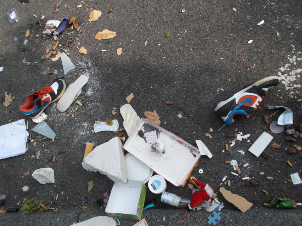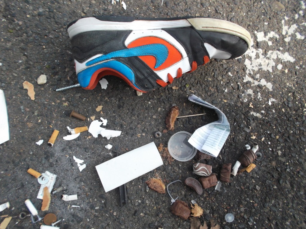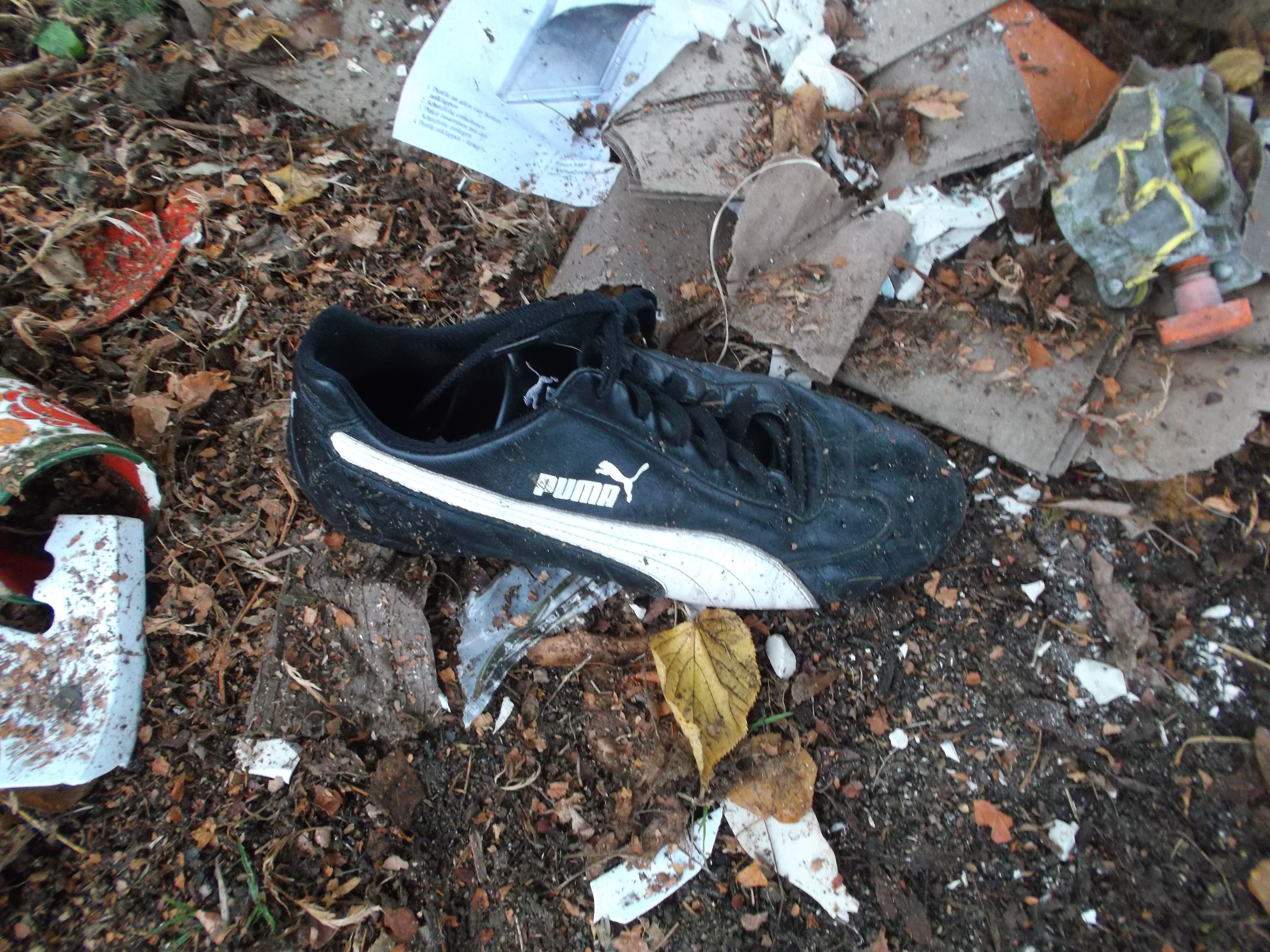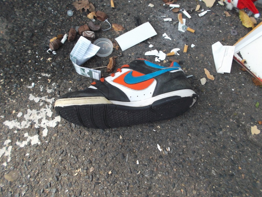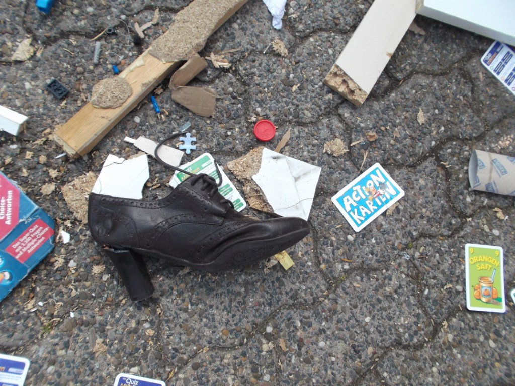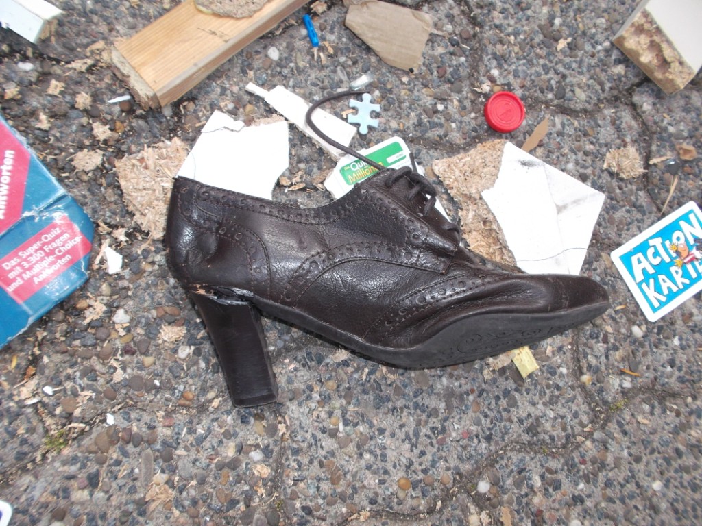 Warum sah dieser Schuh so aus und wo war der andere? Entweder wieder aus der Müllschüttung gefallen oder das Müllauto rollte achtlos drüber.