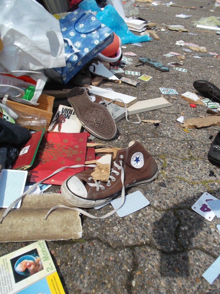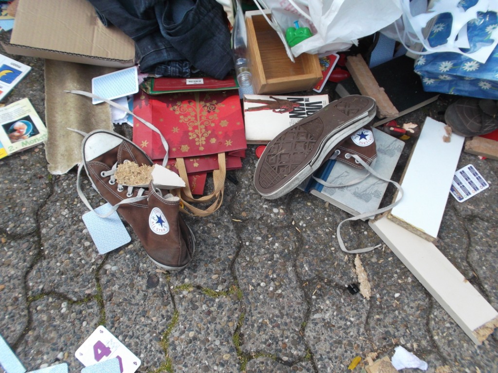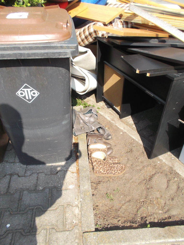 eine zierliche junge Frau hatte die Gelegenheit genutzt, ihre alten Stiefelchen zu entsorgen. Während sie die drei Paare fein säuberlich zum übrigen Gerümpel gestellt hatte, kam ich mit ihr ins Gespräch. Sie gab ihre Hoffnung zum Ausdruck, dass vielleicht sich noch jemand ihrer alten Lieblinge erbarmt und sie mitnimmt. Ich meinte, dass es wohl nur noch wenige Stunden bis zur Sperrmüllabfuhr sein könne und die Zeit dafür sehr knapp. Außerdem würden in ihrem Ort keine Schuhe von der Sperrmüllabfuhr eingeladen. Nunja, bei der Frau starb die Hoffnung natürlich wie so oft zuletzt und sie wollte nicht (selbst) ihre alten Lieblinge zum stinkenden Ekelmüll stopfen. Wenn schon, dann wäre für sie die Sperrmüllpresse die "sauberere Entsorungsvariante". Dann meinte sie noch: Wer werden es ja sehen