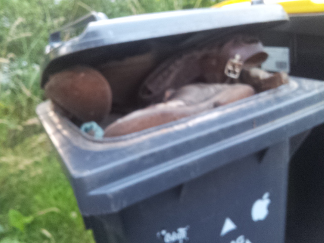 Anderer Ort, andere Tonne, ein Blick und zack gleich ein Erfolg. Ein ganzer Beutel voll mit Schuhen. Das Herz rast und der Jäger hat wieder was erbeutet *gg*