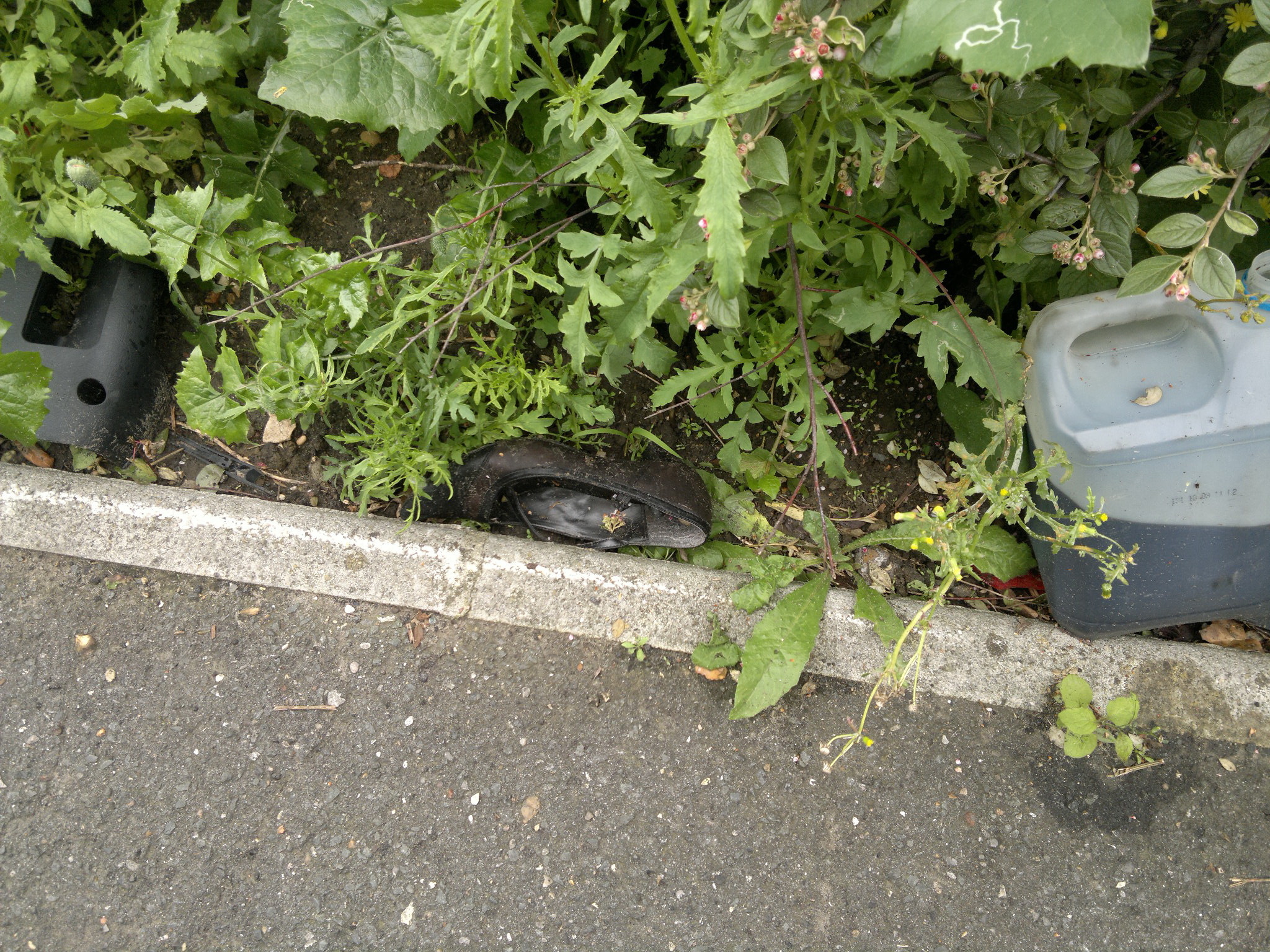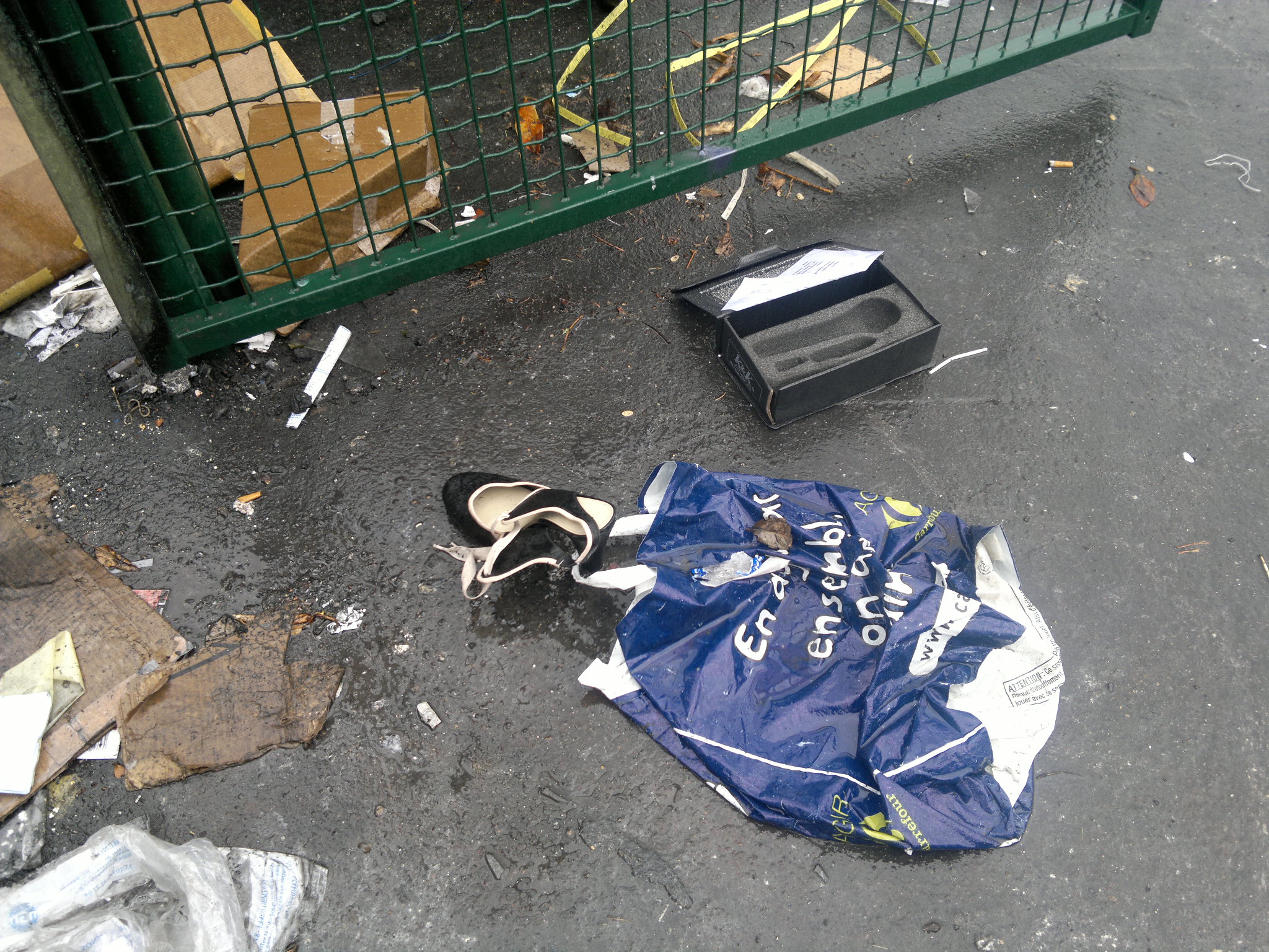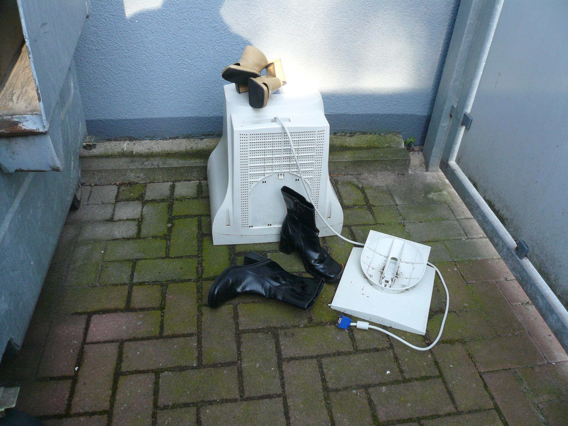 Heute ist sich bei uns auch eine wilde Müllkippe entstanden. Als ich das Foto gemacht habe, war sogar schon ein Paar Schuhe verschwunden, was heute früh noch dabeilag. Die Schuhe kamen übrigens erst jetzt dazu, der alte Monitor lag schon länger da. Die Schuhe sehen aus, als ob sie dort von der früheren Besitzerin regelrecht angeboten werden, so wie eine Präsentation. Scheint ja auch zu funktionieren, denn jetzt ist nur noch ein Paar Schuhe da... :P