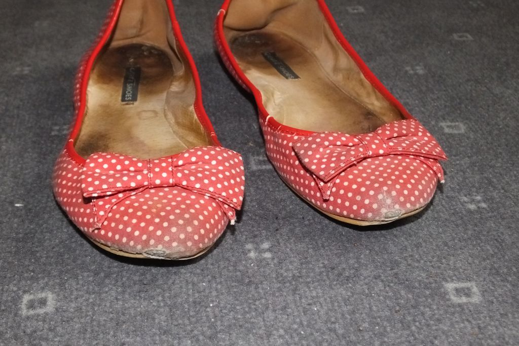 die roten ballerinas sind ja heftig zerlatscht, die müssen ja richtig käsig riechen