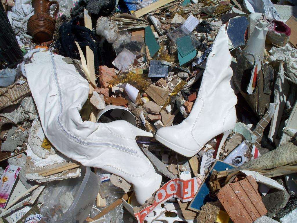 Ich konnte es nicht fassen: Weiße Overknees mit noch kaum verkratzter roter Sohle rutschten den Müllhang herunter. Die mussten eben gerade aus dem Müllauto verkippt worden sein. Schnell machte ich ein paar Fotos, bevor nachrutschender Hausmüll die vermutlich als Bettstiefel genutzten Männerträume verschütten würde: