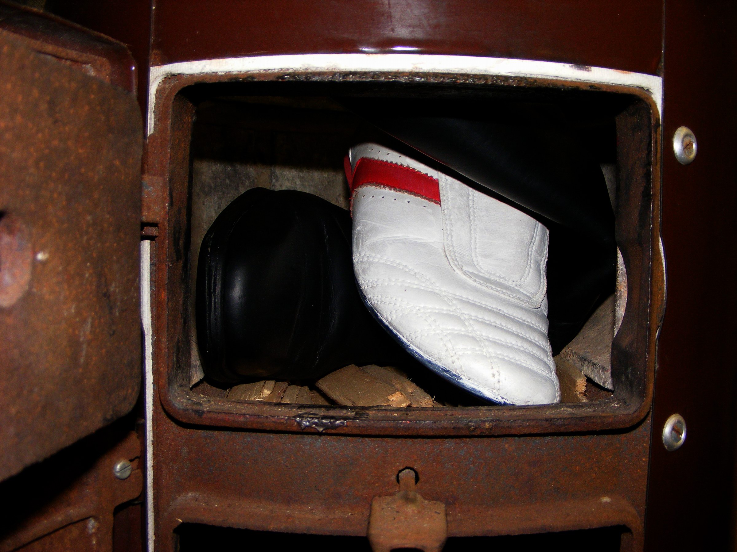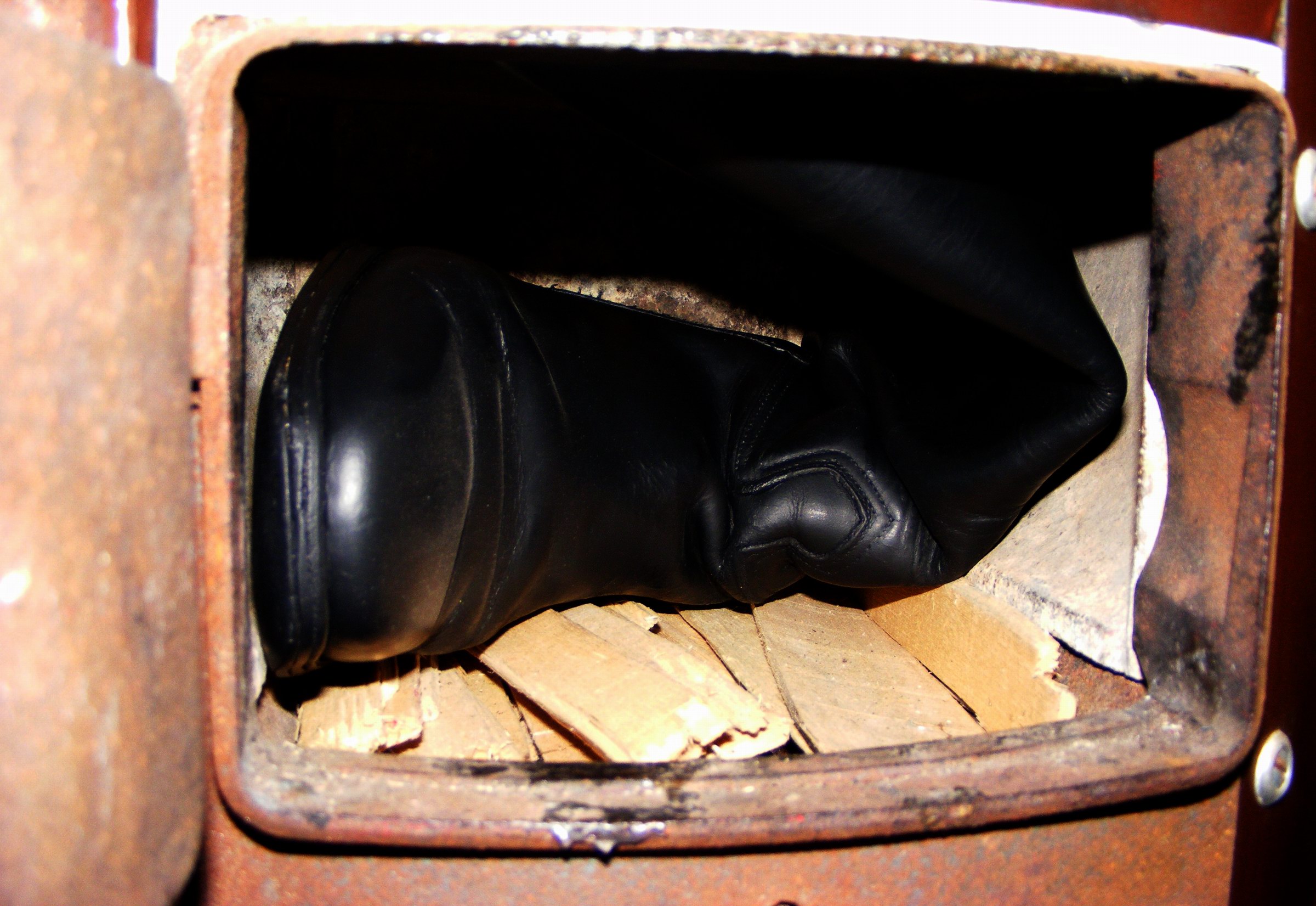 ² Zusammenfassung: Die von meiner BF im Sperrmüll gefundenen Reitstiefel sollten ja bekanntlich beim Essenkochen im Küchenherd Verwendung finden, doch sie bekam die steifen Stiefel nicht in das kleine Feuerloch. Zerlegen war keine Option. Hingegen, der Badeofen wäre mit ihnen problemlos "fertig" geworden; eine geeignete "Zuheizung" hätte sie perfekt Entflammt und in ein Häufchen grüne Asche verwandelt!