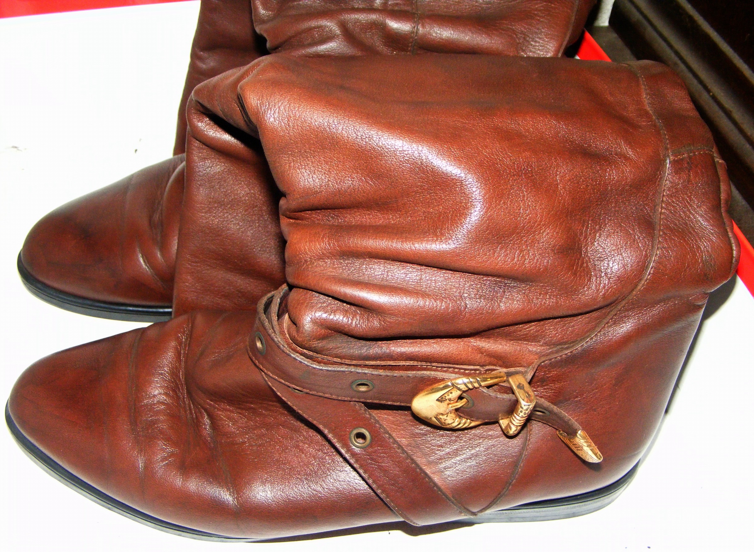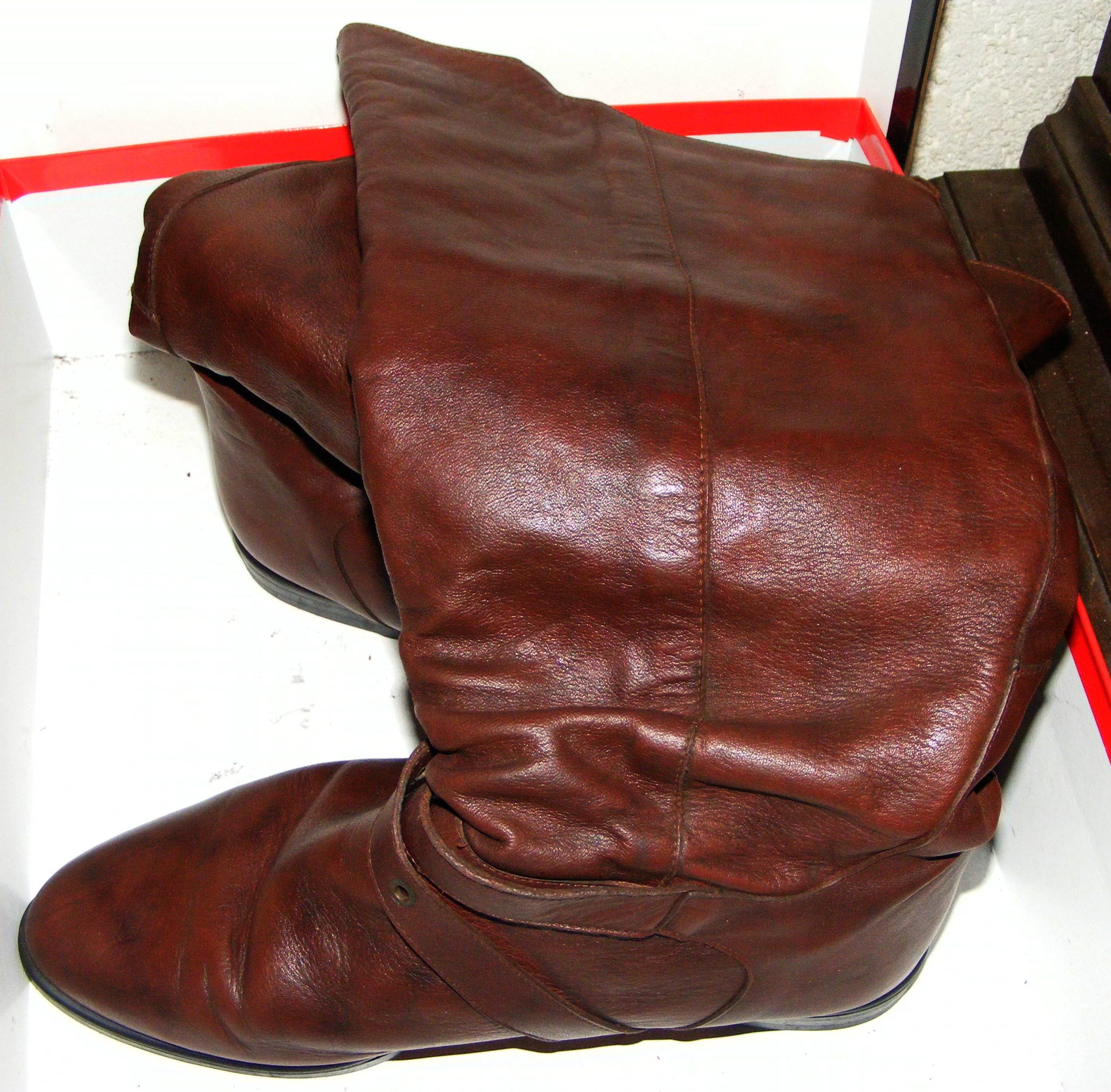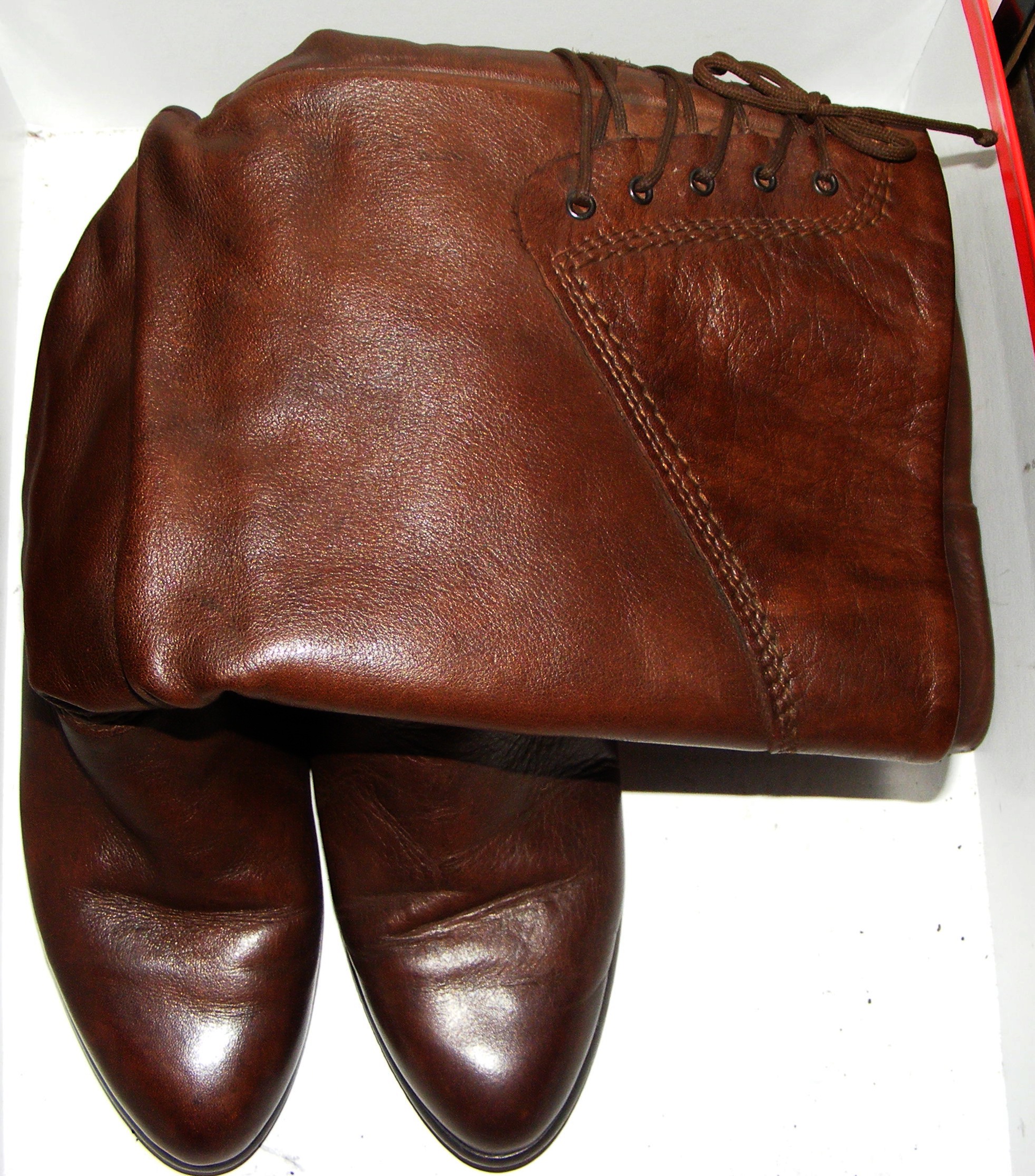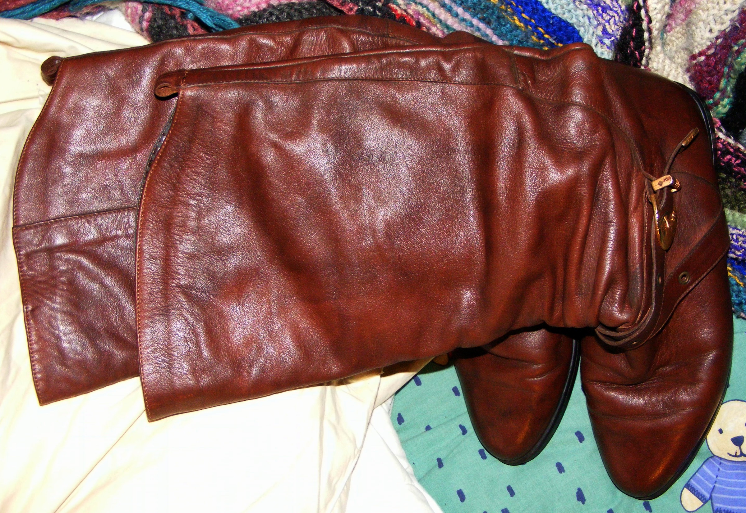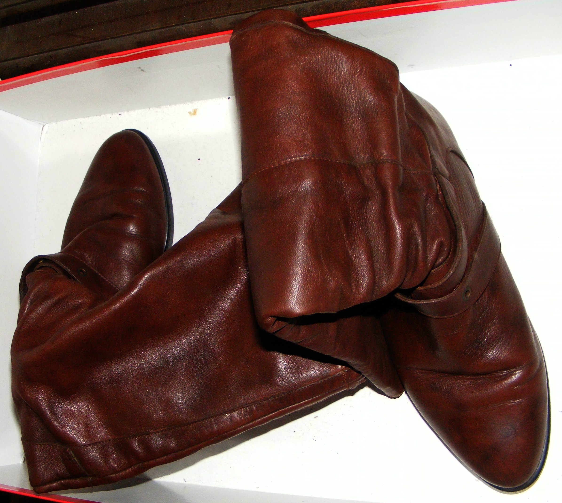 Da ich mich gestern mal wieder ganz kräftig bezüglich brauner Stiefel "Hochgesteigert" habe, hatte ich heute Morgen glücklicherweise nur die Qual der Wahl aus zwanzig Paar braunen Lederreitstiefeln. Letztlich entschied ich mich für diese Teile. Ich habe sie im Februar 2000 von einer Studentin aus Staßfurt bekommen. Eigentlich ebenfalls eine "kranke" Schuhliebhaberin, doch trotzdem wären die Stiefel beinahe in den Ofen gekommen, weil sie seinerzeit auf Plateaustiefel (wie eklig!) stand. Ich hatte mich immer an ihrem Anblick "erfreut", wenn sie die Stiefel trug. Als ich die Teile längere Zeit, schon Schreckliches ahnend, vermißte, fragte ich gezielt danach und konnte sie bei ihr zu Hause in Staßfurt abholen. Obwohl die Stiefel bereits einige Zeit eingestaubt auf den Kohlen im Keller lagen, gab ich ihr sogar noch zehn Mark dafür, in der Hoffnung, daß sie noch eventuell andere Teile vor dem Verbrennen bewahrt und mir anbietet. Doch dafür war es leider schon zu spät. Von einem Paar schöner langer schwarzer Westernstiefel, die mich sehr interessiert hätten, war nur noch Einer vorhanden. Da sie ihre Schuhe nicht paarweise verbrannte, lagen auch noch mehrere einzelne Sandaletten, Pumps und Schnürschuhe zwischen den Kohlen. Es kam eben jeweils das in den Heizungsofen, was die Schaufel zufällig erwischte. Die braunen Reitstiefel hatten einfach nur Glück gehabt!