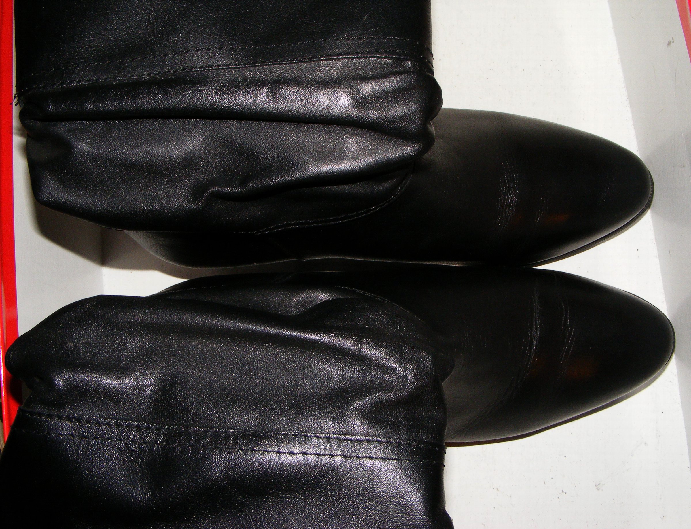 Echtleder-Overknees mit extrem weiten Schäften, die man in einer Hand Zusammenknüllen kann - so Etwas gehört nicht "auf die Straße", sondern zwangsläufig ins Bett!! :P