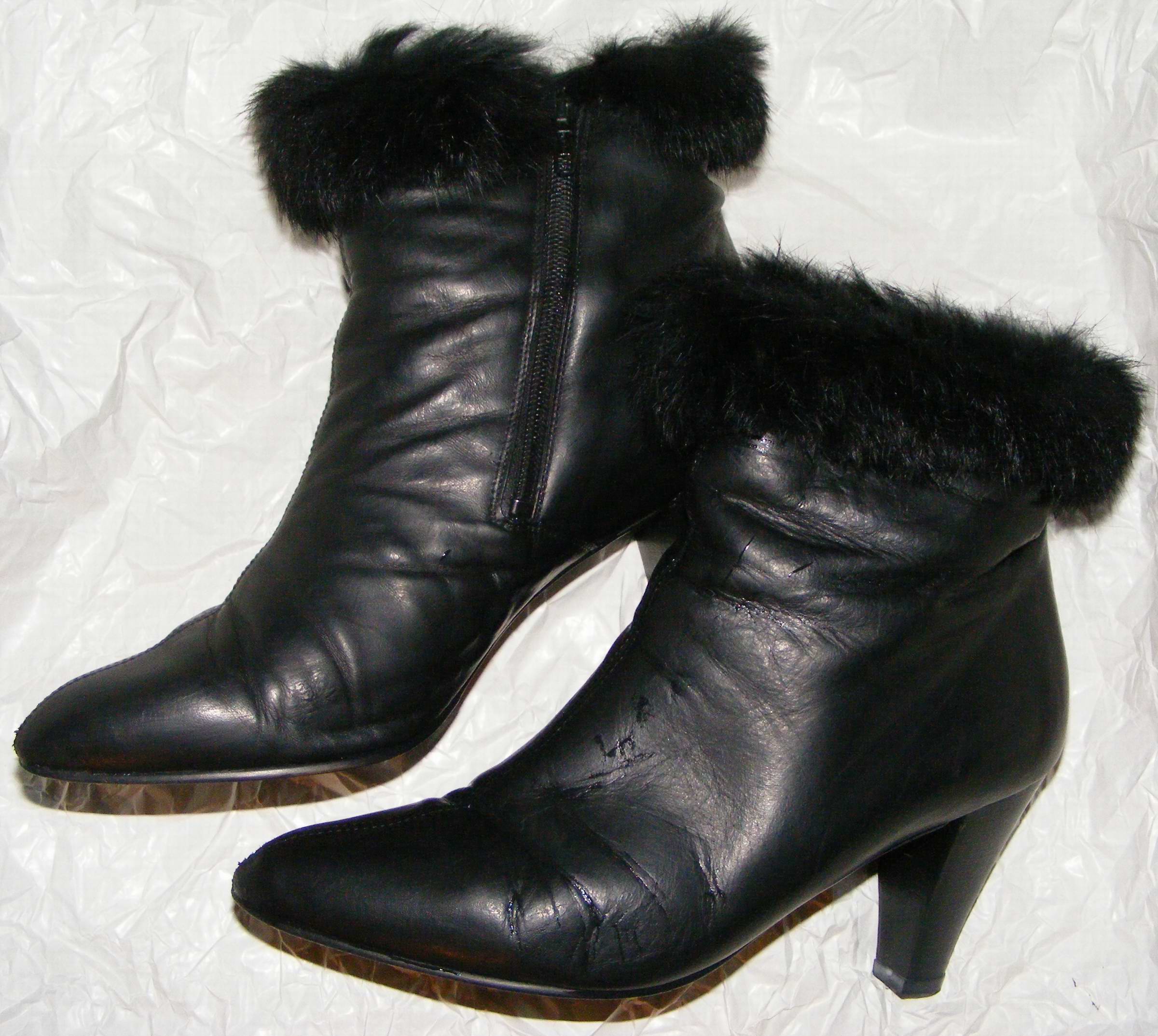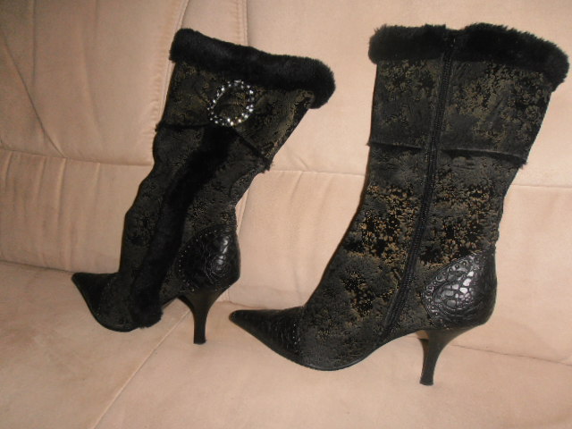 Einmal besuchte mich eine Kollegin, sie brachte alte Schuhe mit und wollte unbedingt mal zusehen, wie sie verbrennen. Wir gingen in den Keller, sie nahm ihre Schuhe aus dem Beutel und stellte sie vor den Ofen. Ich erschrak fürchterlich! Sie wollte doch glatt ein Paar echte Zara-Stiefeletten brennen sehen! (Leider gelangen mir auf die Schnelle nur diese beiden schlechten Fotos.) Ich mußte ja sofort handeln! Ich griff nach einem Paar auf dem Brennholz abgelagerten Stiefeln und konnte mit deren beispielhafter Verbrennung meine Kollegin zufrieden stellen. Die Temperatur des Kessels stieg auf das Maximum an und wir gingen wieder nach Oben. Während des Kaffeetrinkens hatte sie dann glücklicherweise ihre eigenen "Opfer" vergessen. Ich holte sie später aus dem Keller und arbeitete sie für mich auf. Und so präsentieren sie sich jetzt als "Mitglieder" meiner Sammlung! Für mich sind diese Zaras die schönsten und bequemsten Stiefeletten aller Zeiten! Eine Vernichtung, gleich welcher Art, käme niemals in Frage!