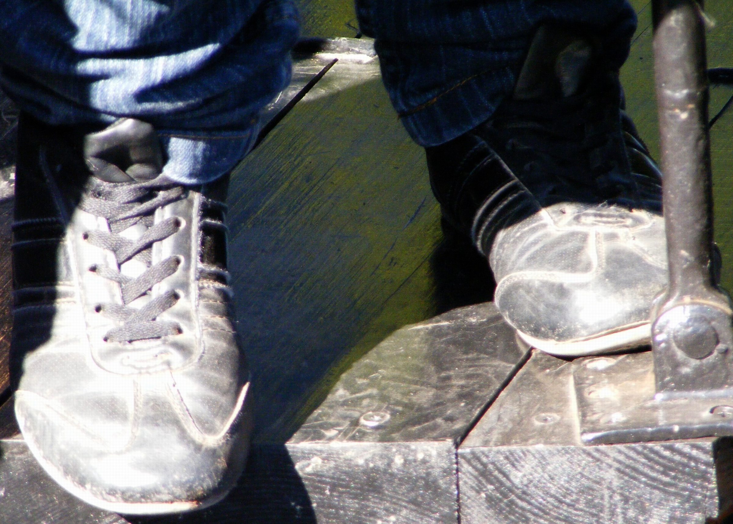 Seine Hände an den Absätzen - die Hacken ein Wenig auseinander - die Spitzen eng zusammengestellt - ein kräftiger Angriff von Hinten in die Nietenketten - das gibt "Glanz" auf die Spitzen, wo die Zehen die Wärme sehnsüchtig erwarten ... :P