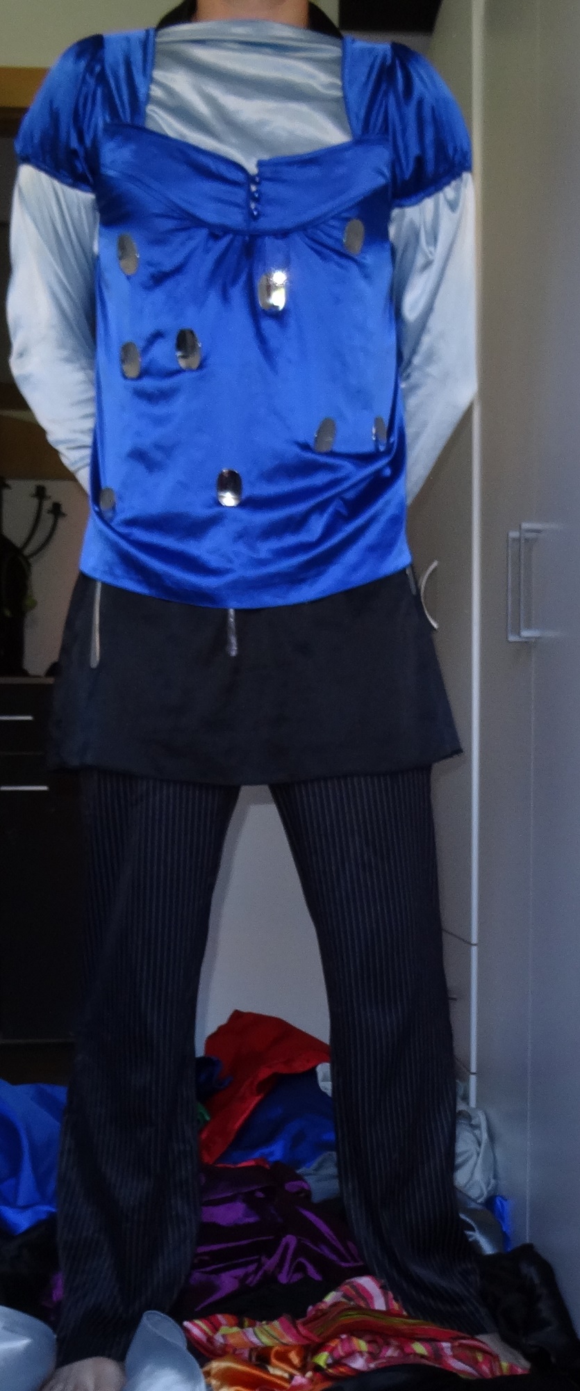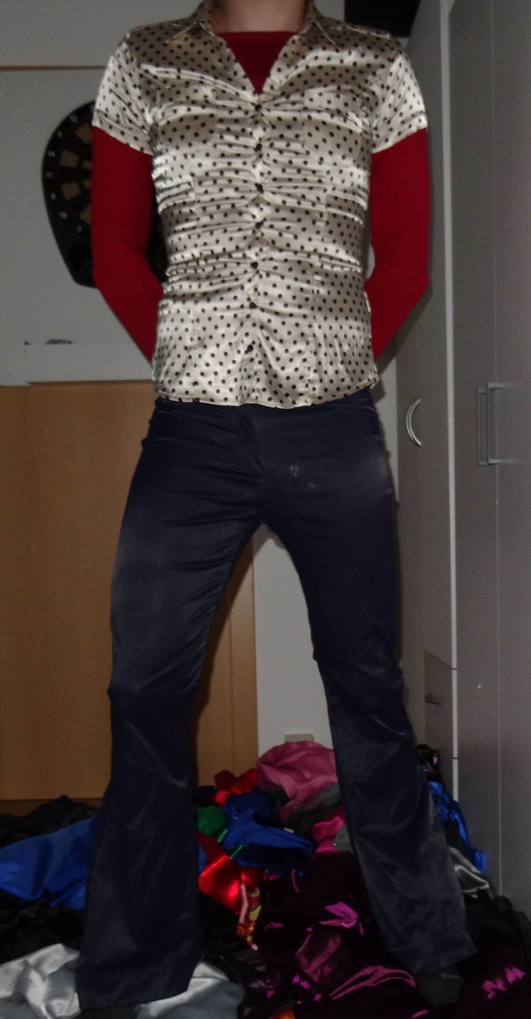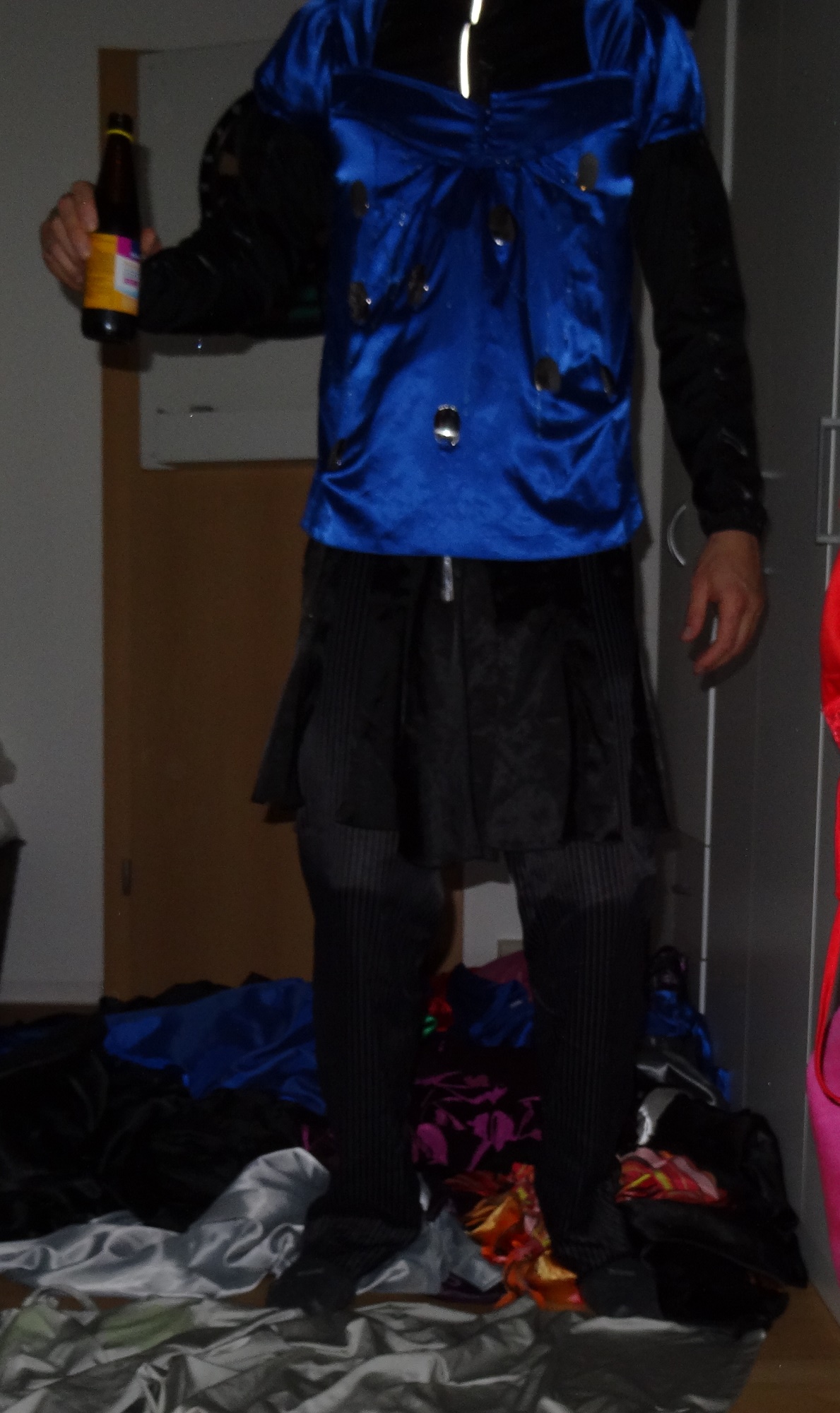 Dazu 'ne Schwarze Stoff oder Satinhose. :o