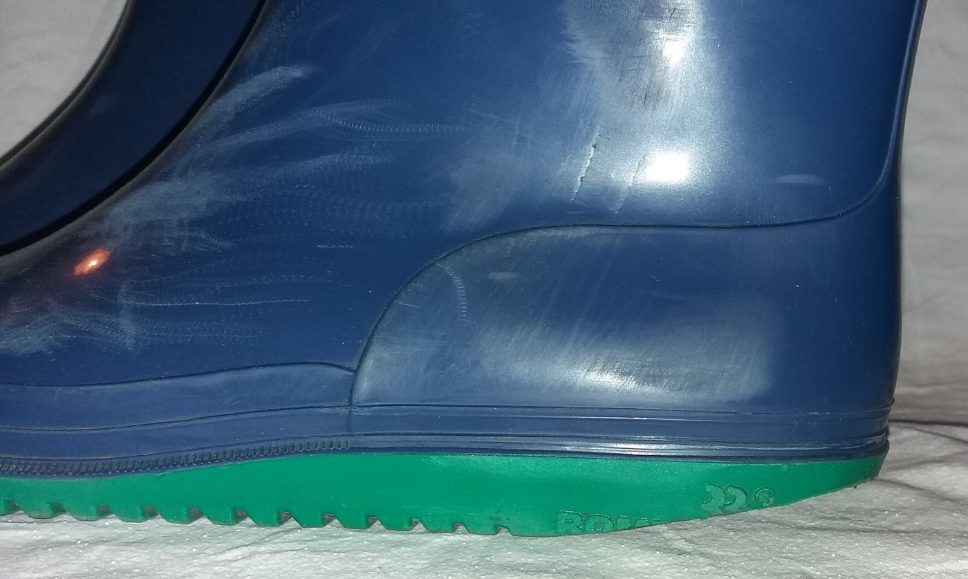 Ich bin der Idee gefolgt und habe einen Bobby mit Schleifpapier abgeschliffen. Echt klasse, der Stiefel wurde mit Schrammen versehen und der Glanz des gelben PVC ist fort.