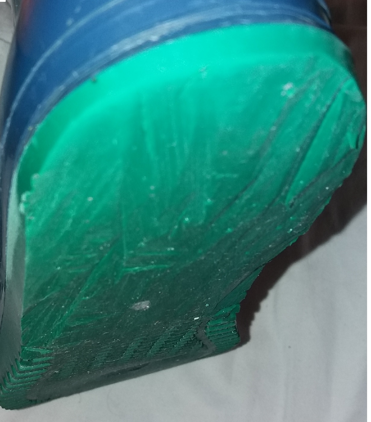 , indem ich etwa auf halber Länge des Stiefels das Messer ansetzte und die Sohle nach hinten wegschnitt. Jetzt fällt die Sohle flacher zum Hacken hin ab und das Laufen fällt wieder einfacher. Das minzgrüne PVC weißt jetzt am hinteren Ende noch eine Stärke von etwa 3 bis 4 Millimeter auf. Jetzt soll der grüne Teil der Sohle erst einmal abgelatscht werden, bevor ich den Bobbies weitere Schnitte verpasse. Ich hoffe, das Loch am unteren Rand des Schafts reißt bis dahin nicht weiter auf.