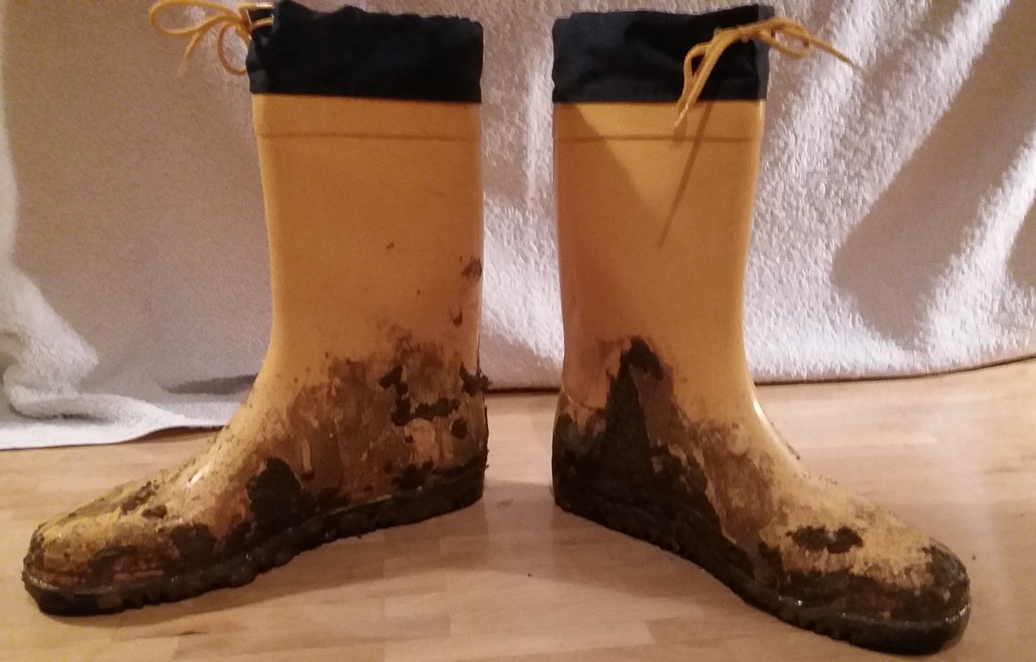 Des Öfteren war ich mit den Bobbies im Lehm und Matsch. Der Lehm ist gut klebrig und bleibt eine ganze Weile an den Stiefeln hängen. Im Matsch habe ich die Bobbies immer wieder in den aufgeweichten Boden gebohrt. Allerdings gelang es mir an dieser stelle nicht, die Stiefel vollständig in der Matsche zu versenken und zu fluten. Ich lasse den Matsch an den Gummis haften, bis er sich von selbst löst. Die Bobbies werden so zunehmend dreckiger.