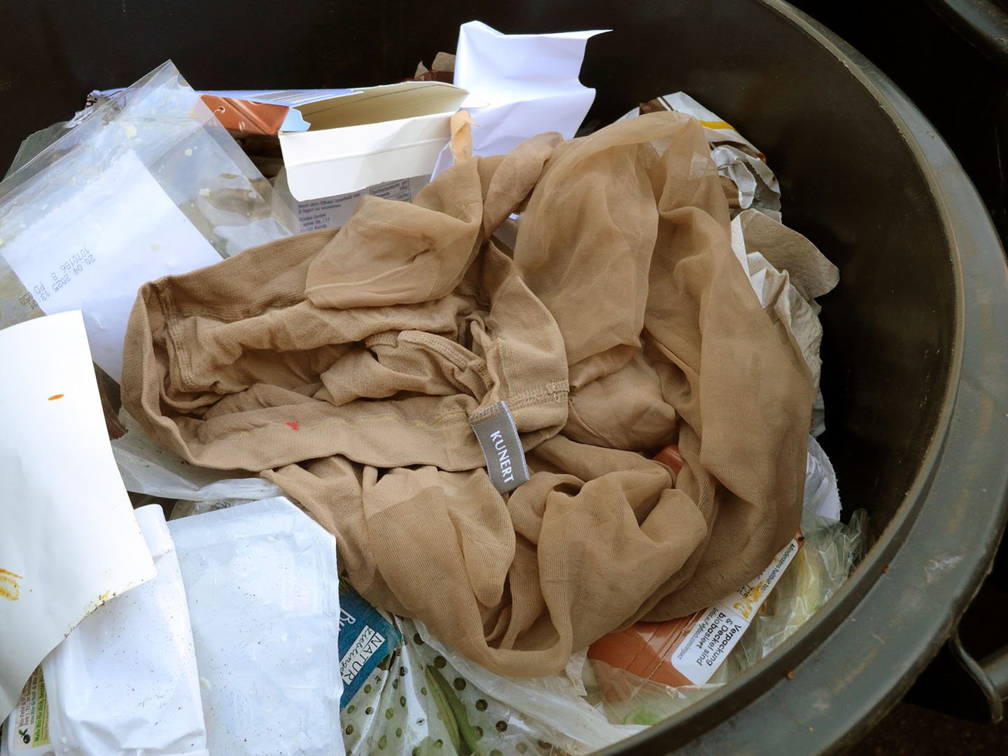 Edel-Unterwäsche und Strumpfhose in der Restmülltonne.