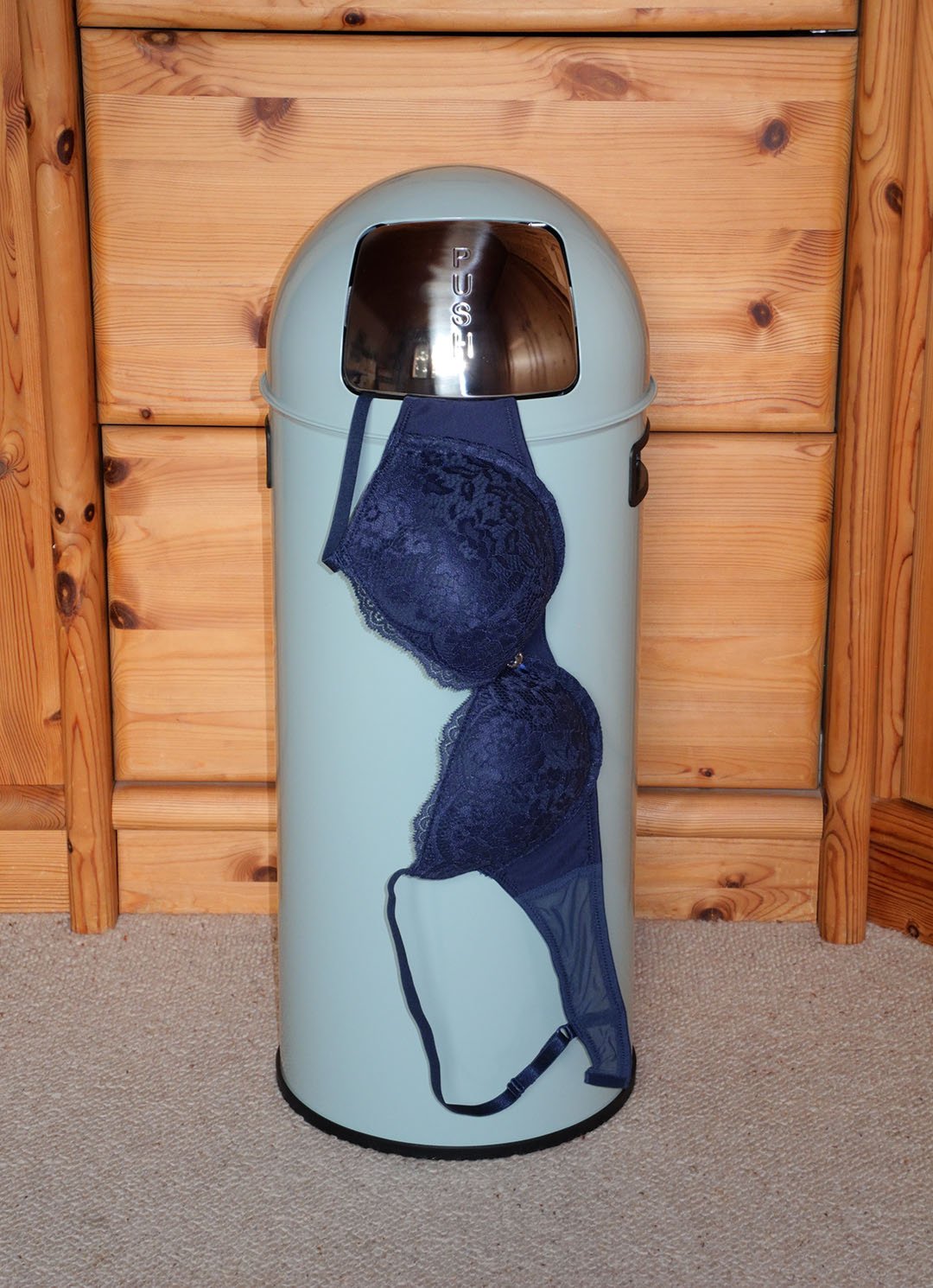 Der unbequeme Büstenhalter sollte das Chalet nicht wieder im Koffer nach Hause, sondern im Mülleimer verlassen. Letztlich lag der schöne BH nur kurz im Mülleimer bevor er wieder rausgefischt und vor dem Ende in einer Schweizer Müllverbrennungsanlage gerettet wurde.