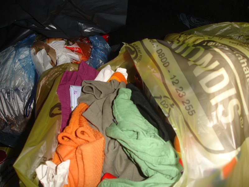 - gleich zwei volle Säcke mit Kleidung fand sich in einer anderen Tonne. Leider keine Schuhe, dafür Hosen, T-Shirts, Spcken, BH's usw.