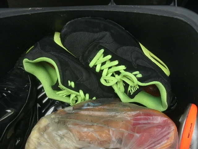 Optisch sehen die schwarzen Airmax mit dem Neon-Innenfutter "frisch" aus, aber nach einigen Tagen im Hausmüll wäre eine Gasmaske mit Aktivkohlefilter angebracht. Würg!