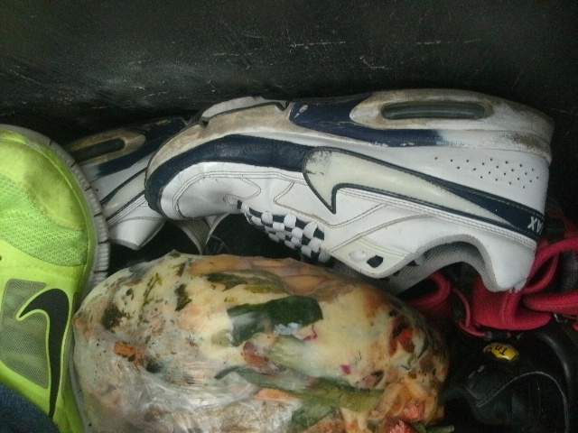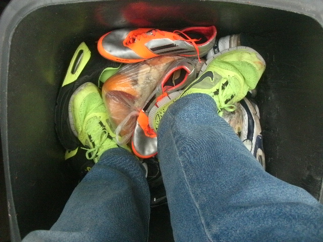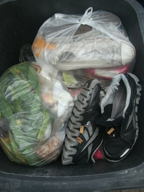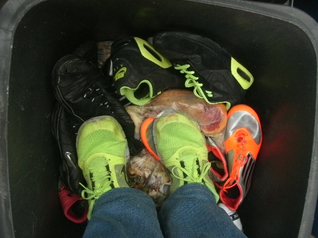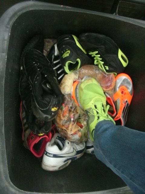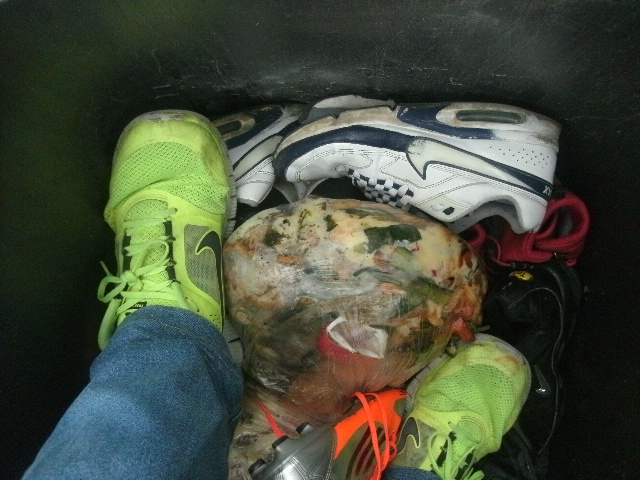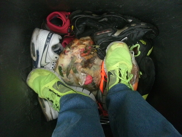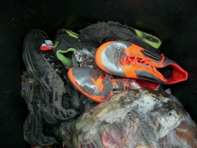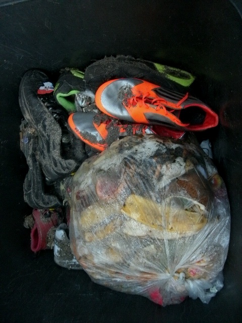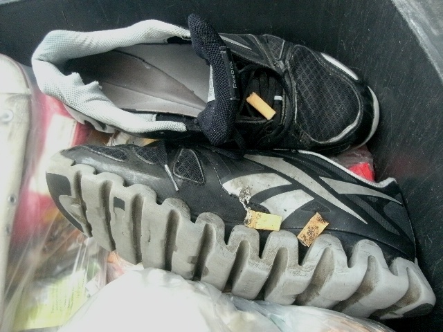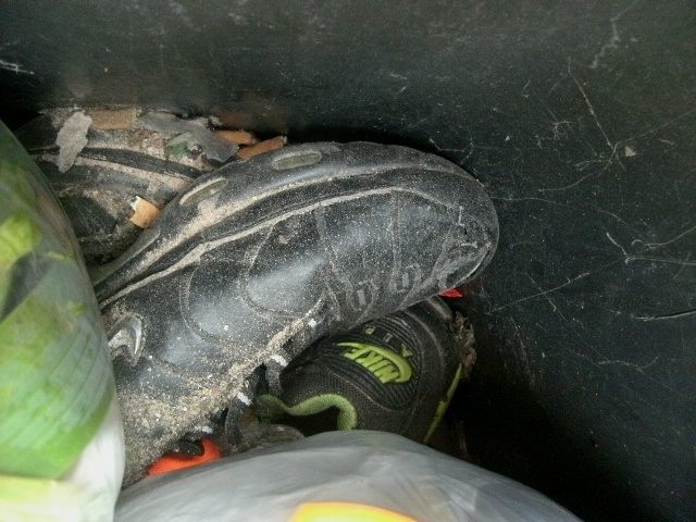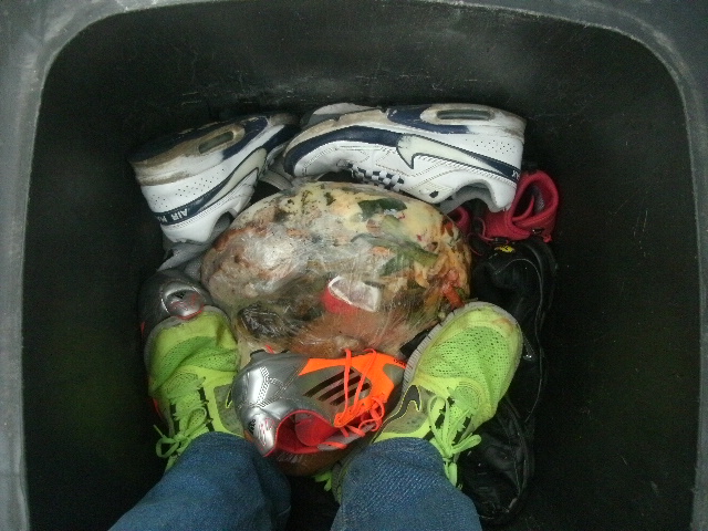 Die Asics lagen nun noch ziemlich tief im Dreck, obwohl sie doch die "letzten" waren, die diesmal in unsere Mülltonne kommen.