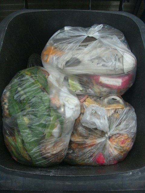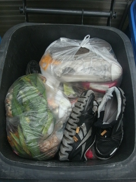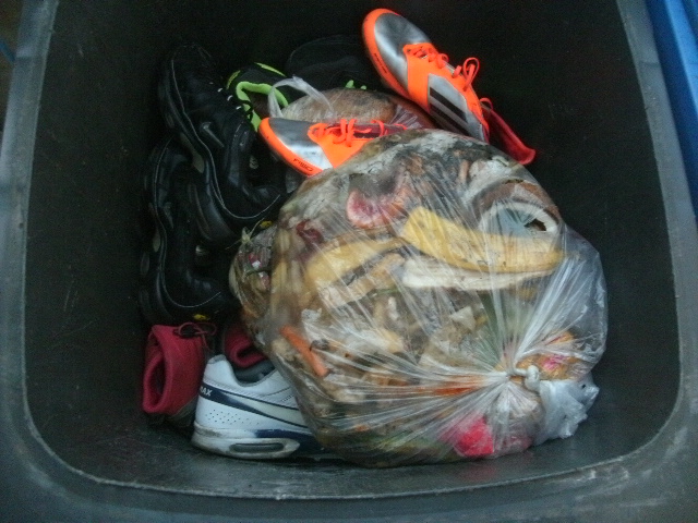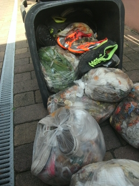 Nachdem alle Schuhe endlich in der Mülltonne lagen, kam auch der Küchenmüllbeutel oben drauf; - endlich alles weggeschmissen.