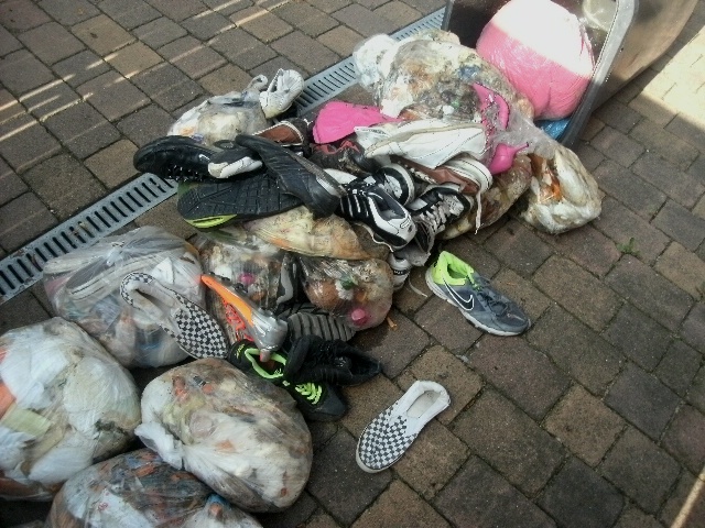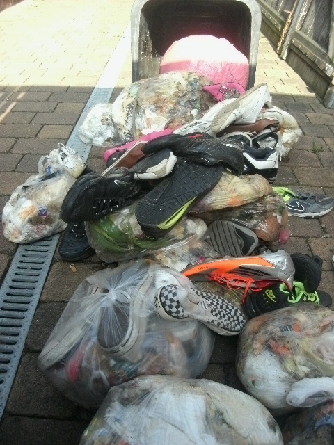 Sneaker, deren Schicksal zuerst noch nicht sicher war, mussten dann doch in den Müll und "bereicherten" unser "Müllkaleidoskop". Schön bunt war es allemal!
