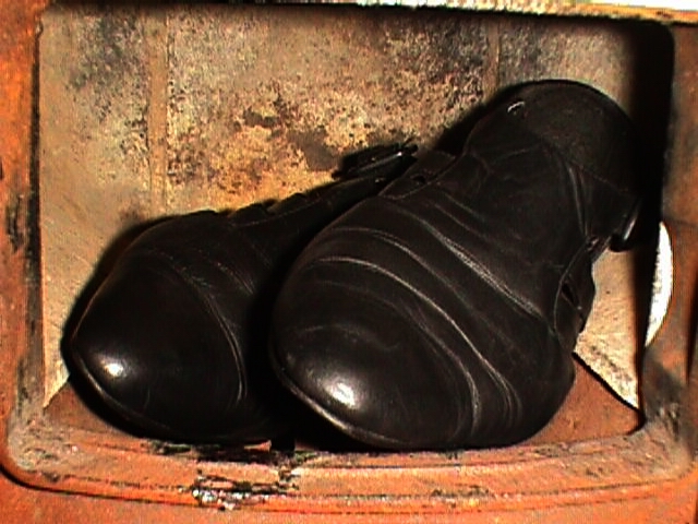 Nun ein Beispiel - eine Demonstrationsveranstaltung mit einem Zwischenrost im Heizungsofen für eine Kollegin, die allerdings nicht überzeugend verlief. Optimal verbrennen Schuhe, wenn sie direkt auf dem Brennholz bzw. auf bereits brennenden Schuhen stehen.
