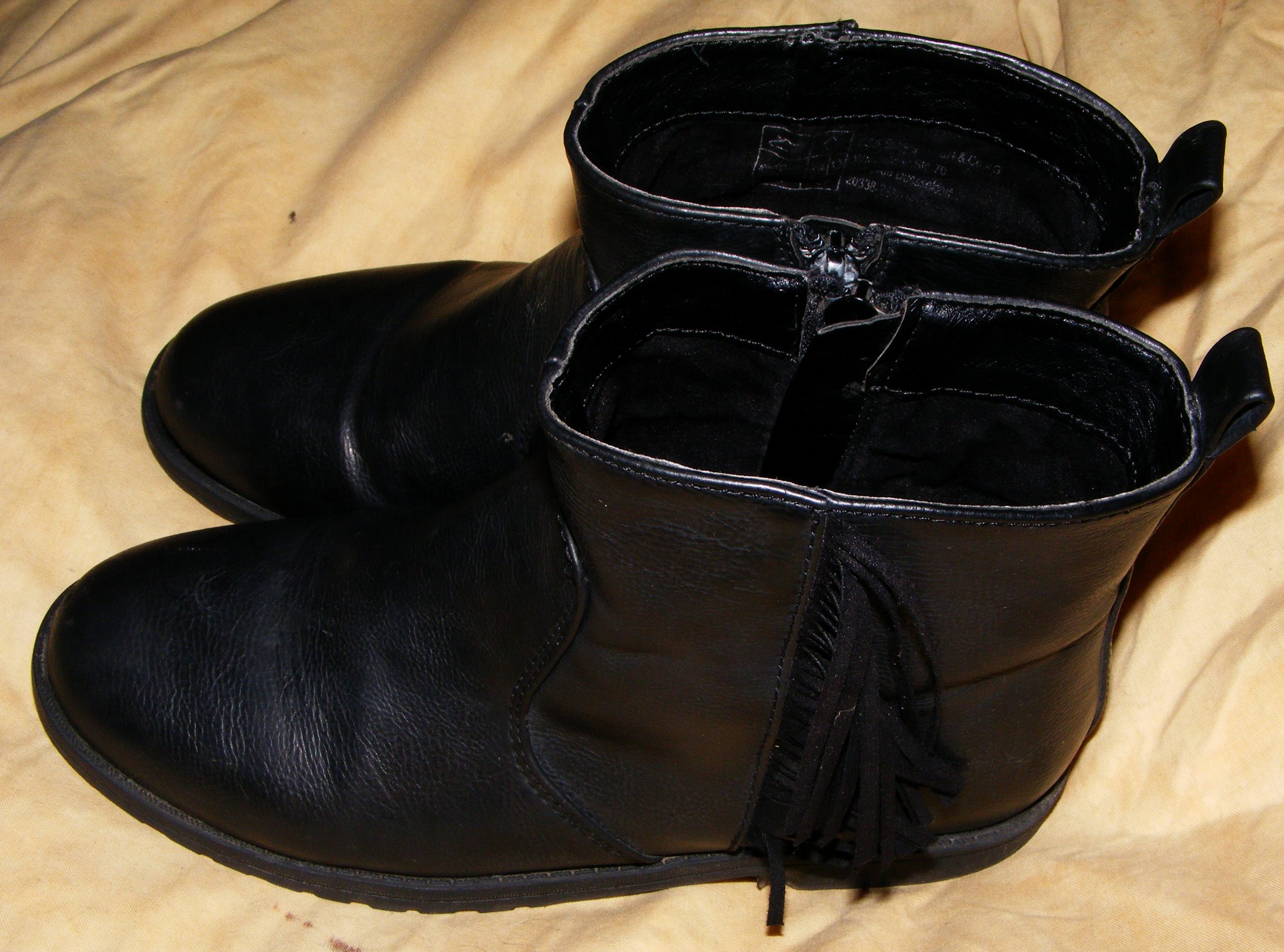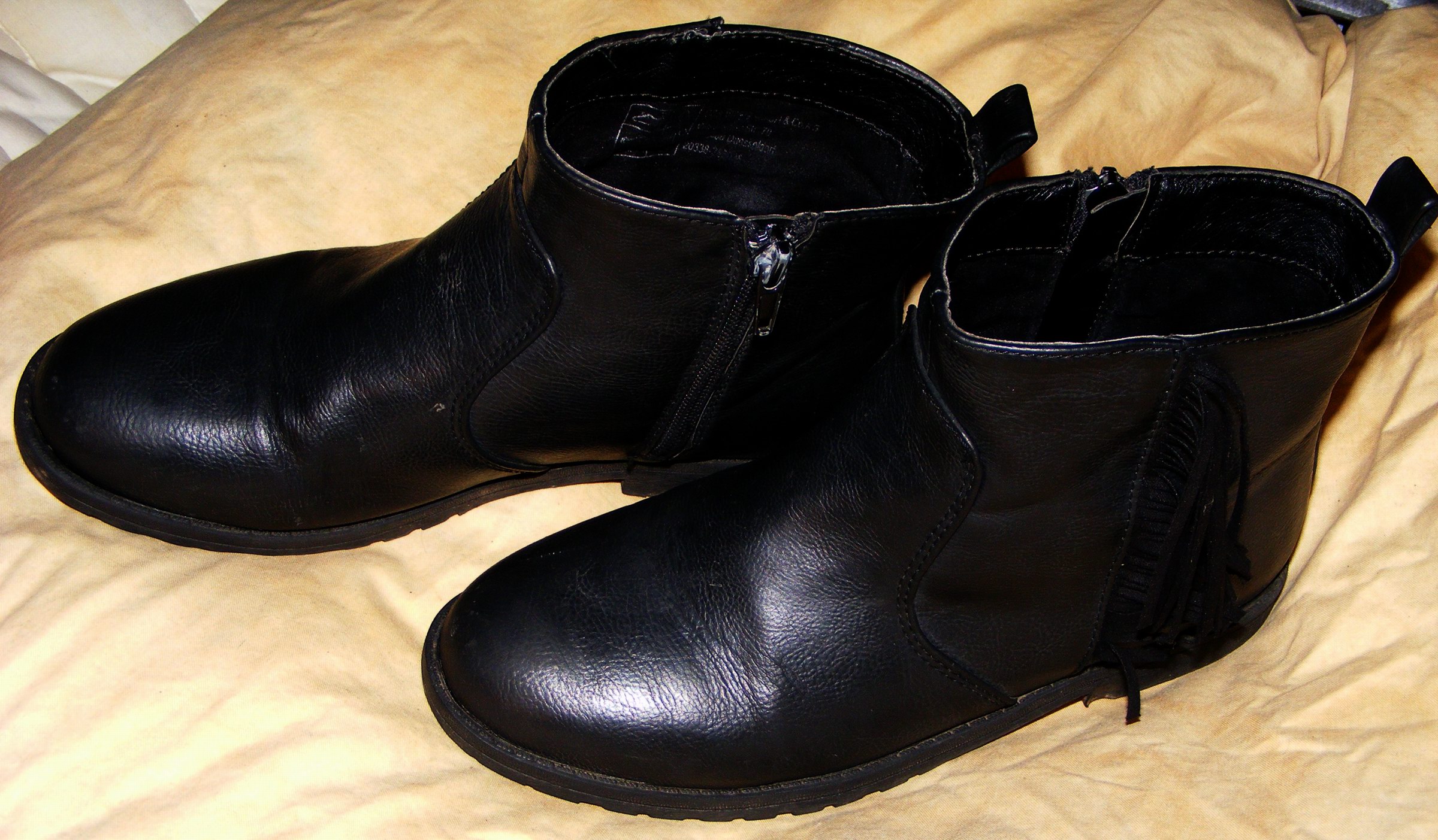 Ich hatte, wie gesagt, einen schwarzen Lederperfecto, eine weiße Zara-Bluse, eine schwarze lange Lederhose und die gezeigten Tangostiefel an. Wider Erwarten verlief das Abendessen erst relativ ruhig und unspektakulär, als mein Mann im Bad war, platzierte ich mich im "Kampfring" (Bett :lol: ). Er kam herein und nach einigen Genießerminuten mit dem kompletten "Haufen knarrenden Leders" zog er mir die Stiefel aus, dann die Hose und den Slip herunter. ² Ganz liebevoll steckte er mir dann wieder die Stiefel an die Füße, raffte die Schäfte so weit es ging nach Unten und massierte mir die Brüste durch das Jackenleder, während ich mit den weichen Stiefelschäften seinen Kumpel so richtig in Stimmung brachte. Dann legte er sich meine Schenkel um seinen Hals und wir "machten Es" auf die allgemein übliche Art ... :)