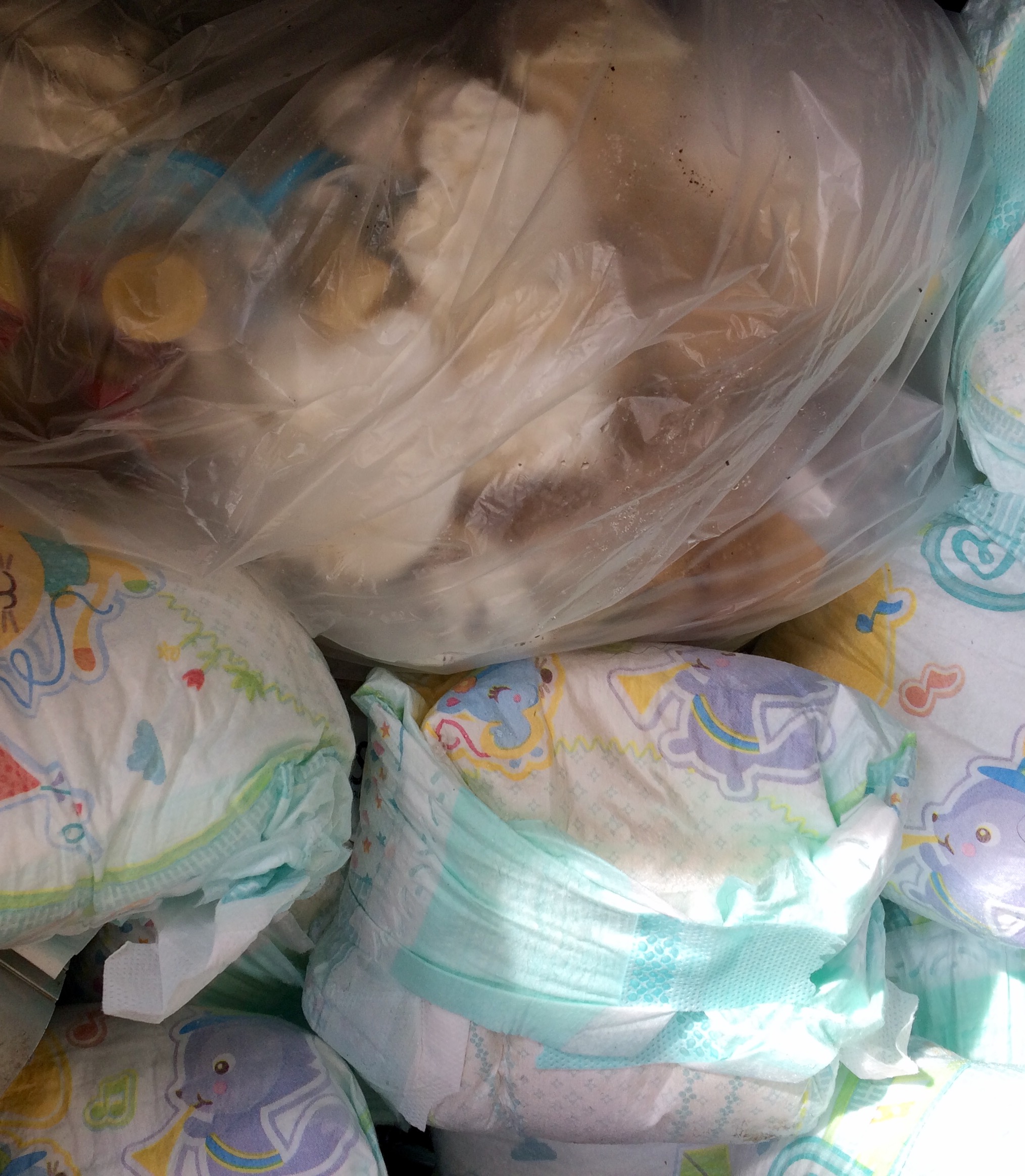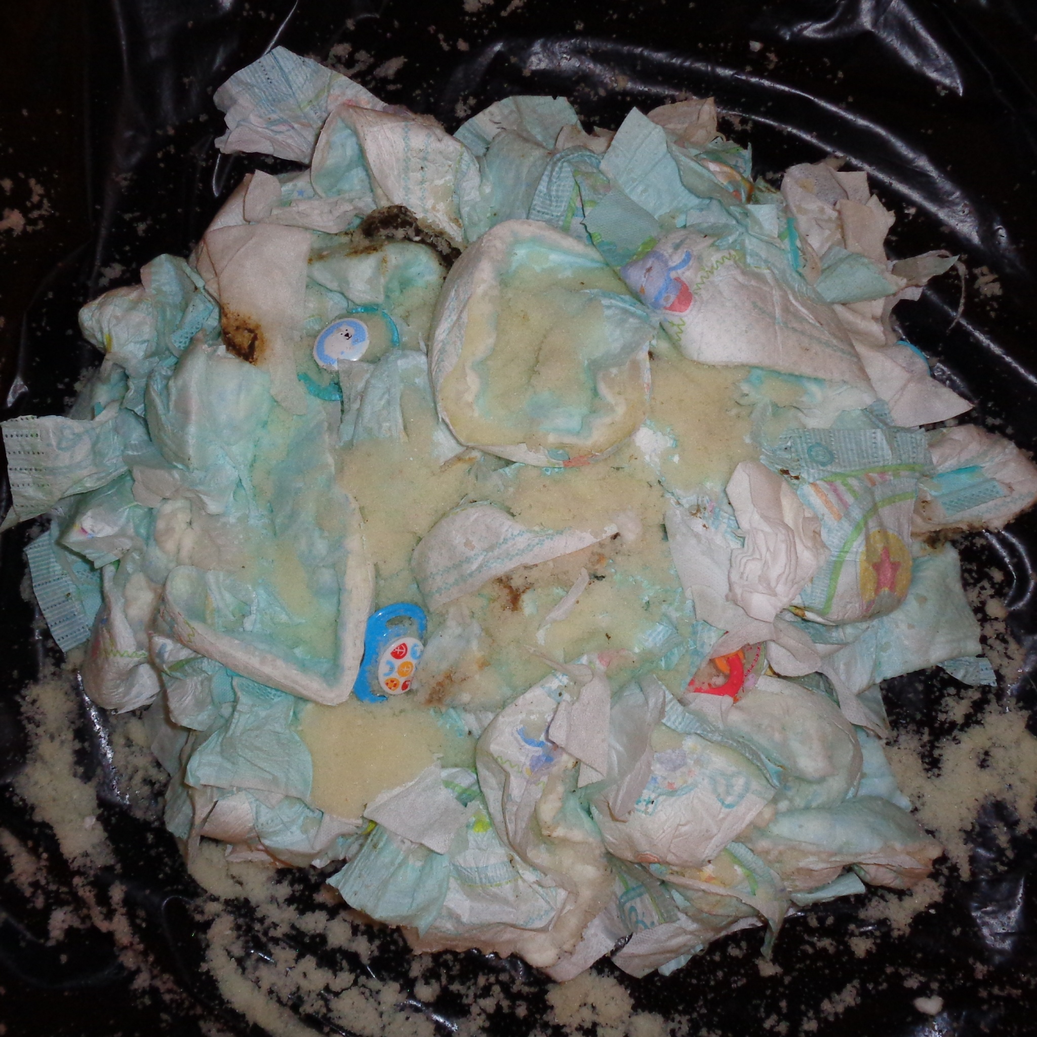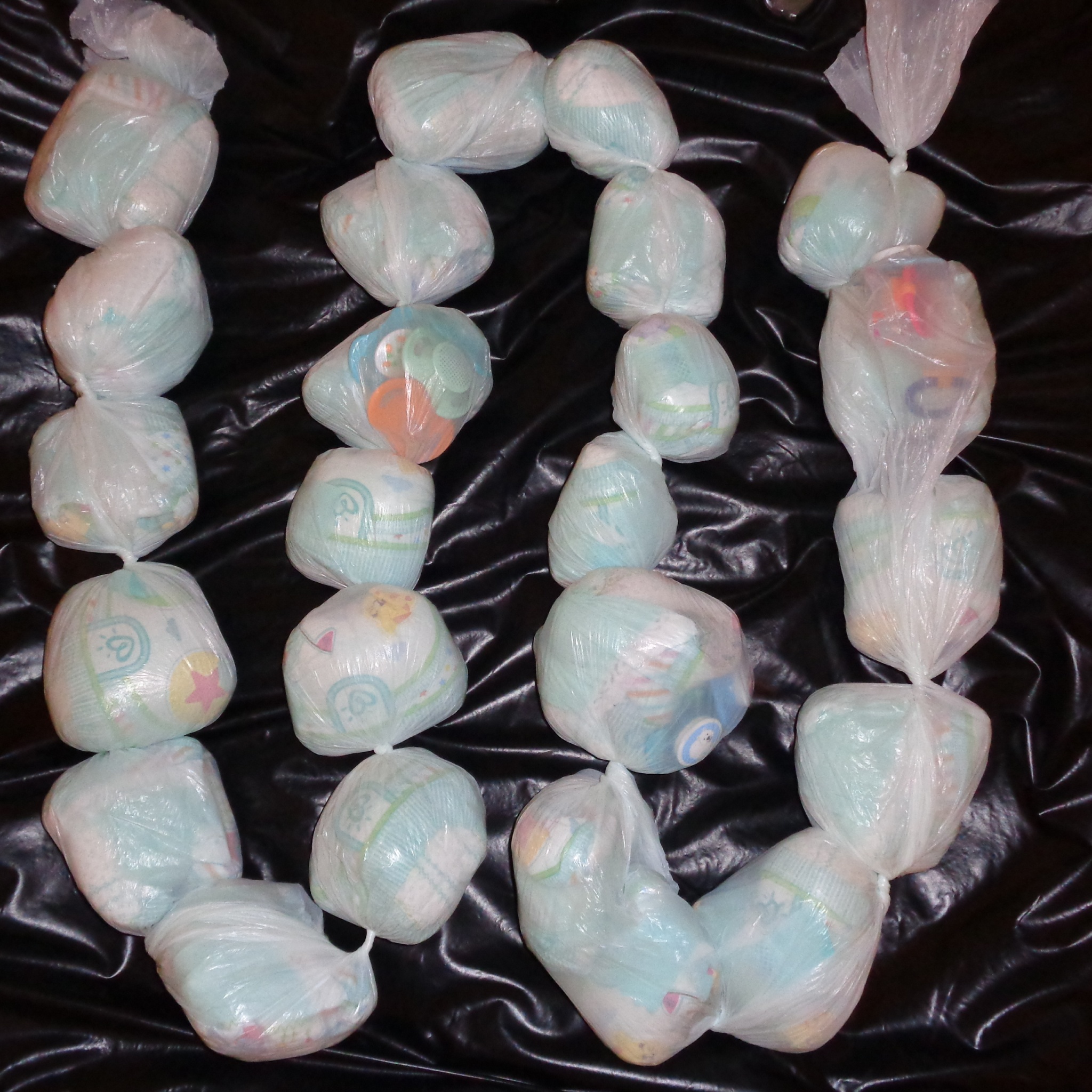Wäre sicher ein riesen Spaß gewesen, wenn du den Müllsack unten aufgeschnitten hättest, während er an der Tür hing. Dann hätten sich Schnuller und Windeln schön vor der Tür verteilt