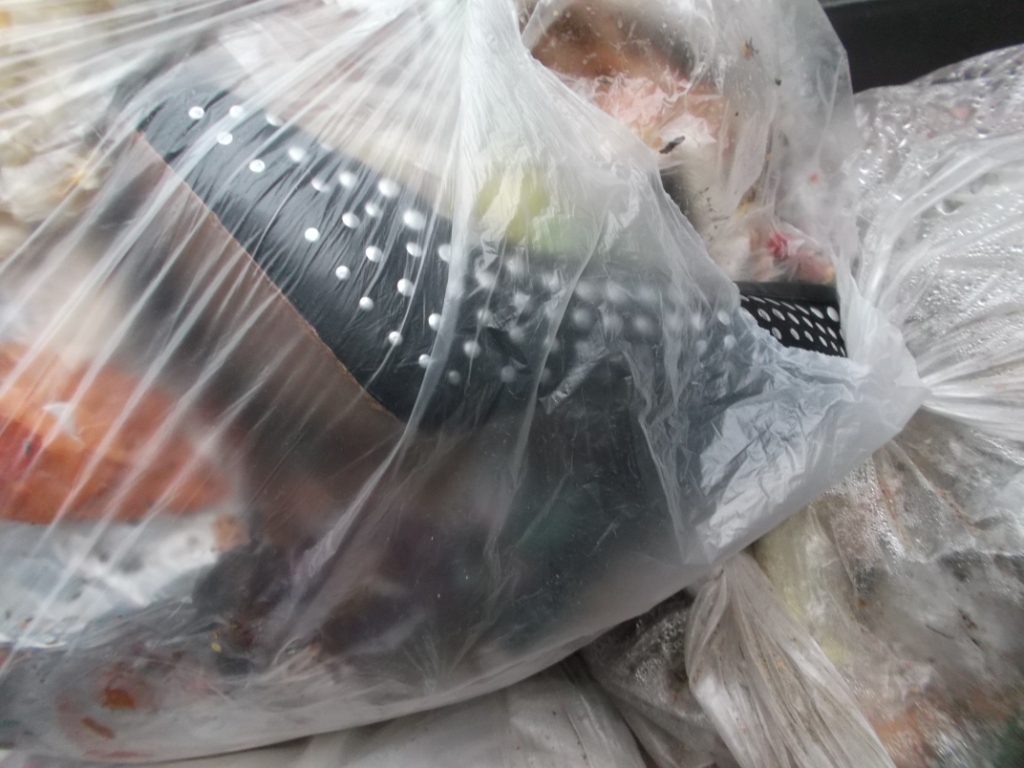der Küchenmüllbeutel mit den weggeschmissenen Stiefeln von Anja lag nun wie zu erwarten in unserer Restmülltonne und der war so prall voll gestopft worden, dass er beim in die Mülltonne werfen sogar ein wenig aufplatzte. Aber er hatte ja lange genug den ganzen Dreck zusammen gehalten: :mrgreen: