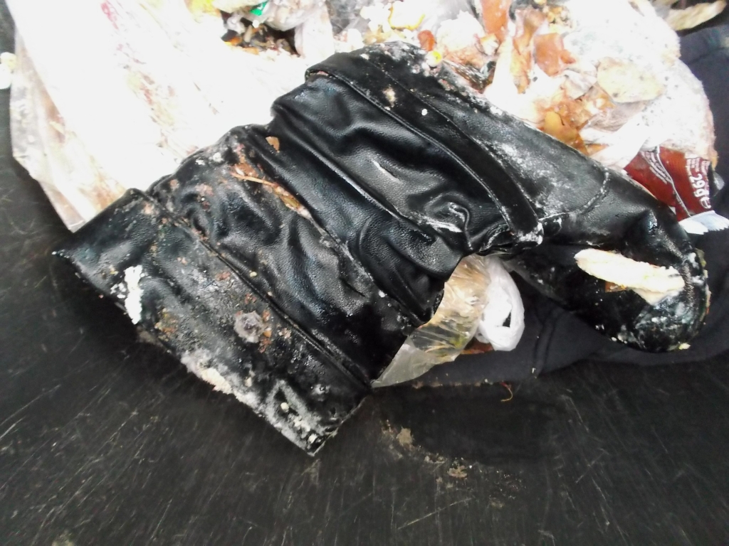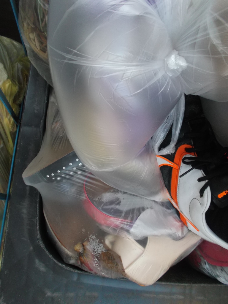 Meist schon im Müllauto sehen alle Schuhe und Klamotten so aus, wenn sie durchgepresst worden sind und viele siffige Mülltüten aufgeplatzt sind.