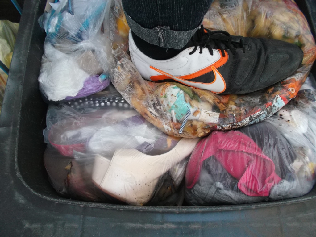Der ganze Dreck musste dringend eingestampft werden, denn so hätte die Müllabfuhr unsere Tonne stehen lassen!