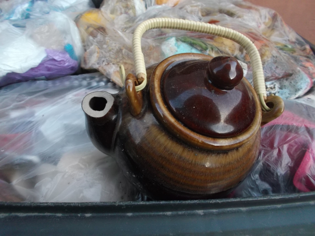 Den ganzen "übrigen" "Restmüll" (Jetzt stimmt der Begriff auch für mich!) wieder in die Tonne gestopft und die kaputte Teekanne noch dazu. Soll doch dass Pressmüllauto das Teil in tausend Scherben zermalmen!