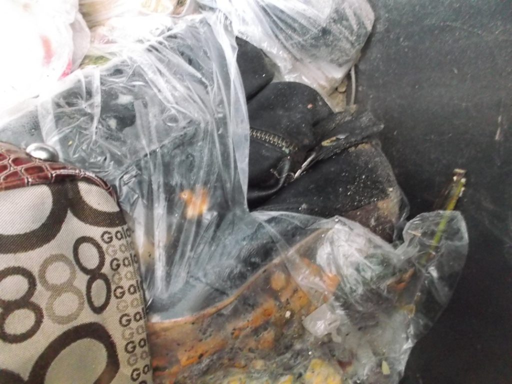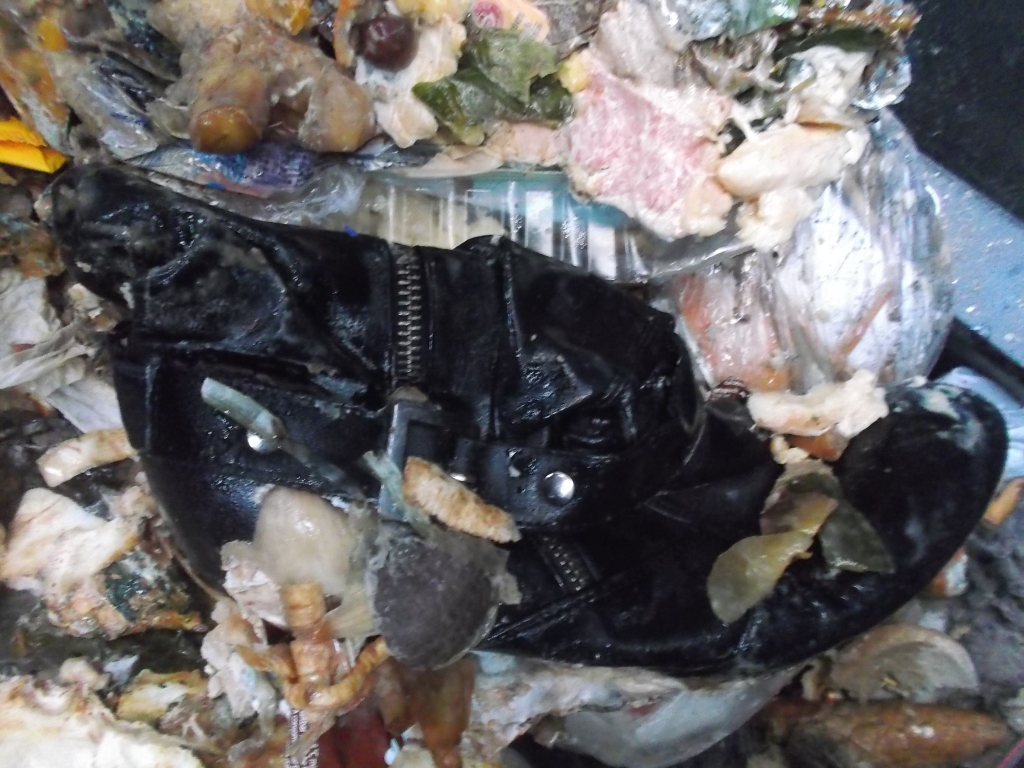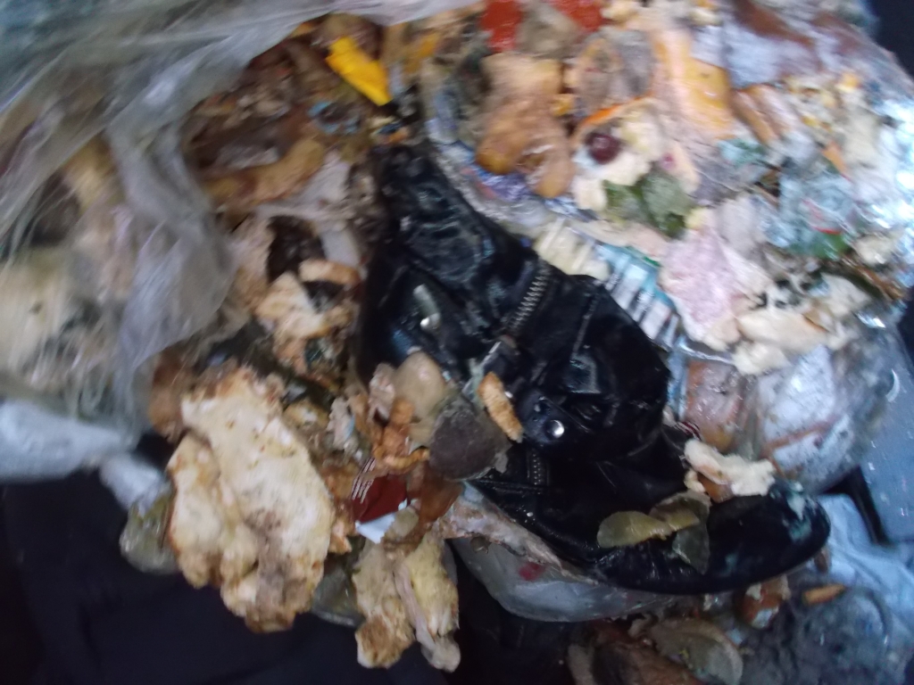 Der andere Stiefel aus dem Müllbeutel war kaum zu erkennen so vermüllt wie der war.