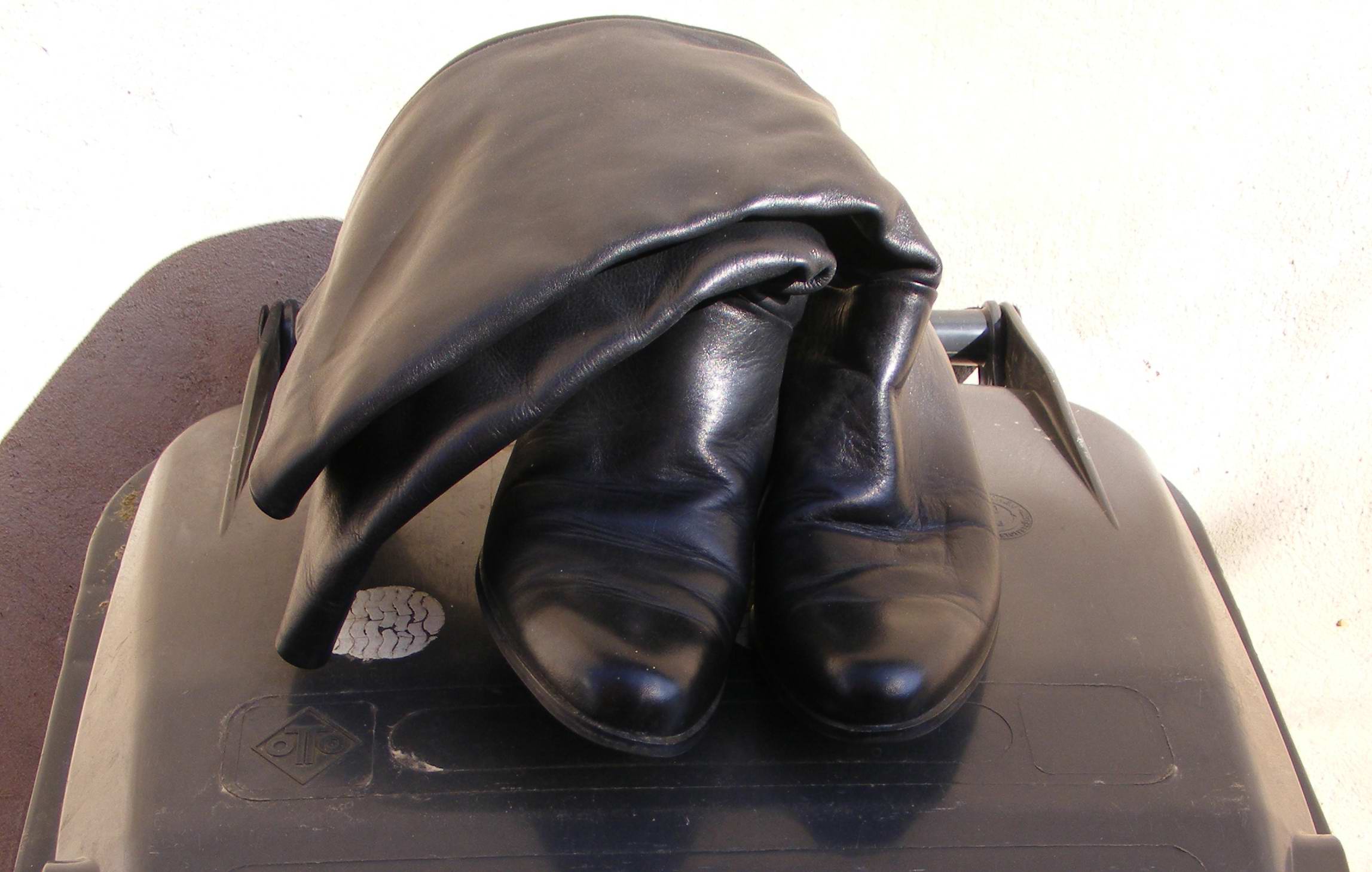 Diese nahezu neuwertigen echten 80er Lederstiefel konnte ich in letzter Sekunde einem Sperrmüllhaufen entreißen, während ich face to face mit meinem Auto vor dem orangen Müllmonster stand. Die Herren der Besatzung zeigten dafür volles Verständnis, nachdem sie mich vorschriftsmäßig gemustert hatten und lediglich folgenden Kommentar ließen: "Je kürzer der Rock, umso länger die Stiefel!" Womit sie natürlich meine aktuell Getragenen meinten! :lol: