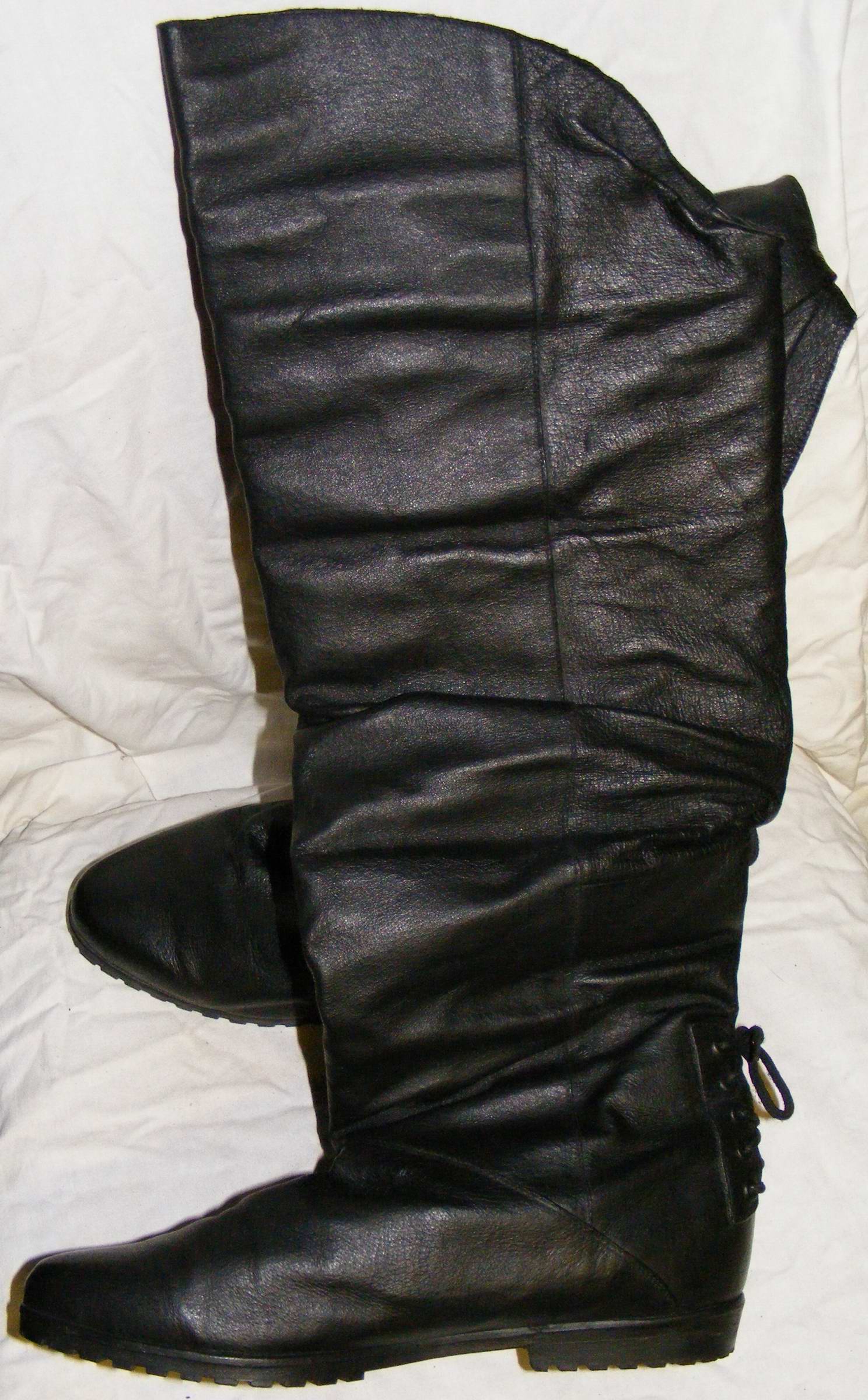Oh, das ist mindestens zwei Jahre her. Es stand mal wieder ein "Wandertag" an. Dafür hatte ich mir eigentlich ein Paar weiche, bequeme schwarze Westernstiefel aus Echtleder vorbereitet. Doch der Wetterbericht sagte übles Regenwetter voraus. Ich erinnerte mich dieser Sperrmüll-Beute, die ich wohlwissend für einen eventuell mörderischen Einsatz noch beiseite gelegt hatte. Ich tat gut daran, diese zu erwählen, denn es ging kilometerweit über nasse grasige Hügel. Ich muß sogar zugeben, daß sie für meine breiten Füße (wie man deutlich sehen kann) sogar richtig angenehm zu tragen waren! Doch wenn man genau hinsieht, hat die schonungslose Nutzung dem Synthetik-Material extrem zugesetzt. Es bekam Risse. Ohne nochmalige Pflege kamen sie wieder in den Keller. Ich habe sie dann im Winter noch einige Male beim Schneefegen getragen, wobei, wenn ich mich recht erinnere, eine Sohle durchgebrochen war. Sie kamen dann direkt in den Heizungsofen. Aber es gab keine besondere "Zeremonie". In der einen Hand hielt ich die beiden Stiefel, mit der anderen Hand öffnete ich die Feuertür. Dann warf ich die Stiefel gleichzeitig auf die hell und kräftig brennenden Kohlen und machte die Tür gleich wieder zu. In dieser Flammenhölle dürften sie nicht lange gelitten haben!
