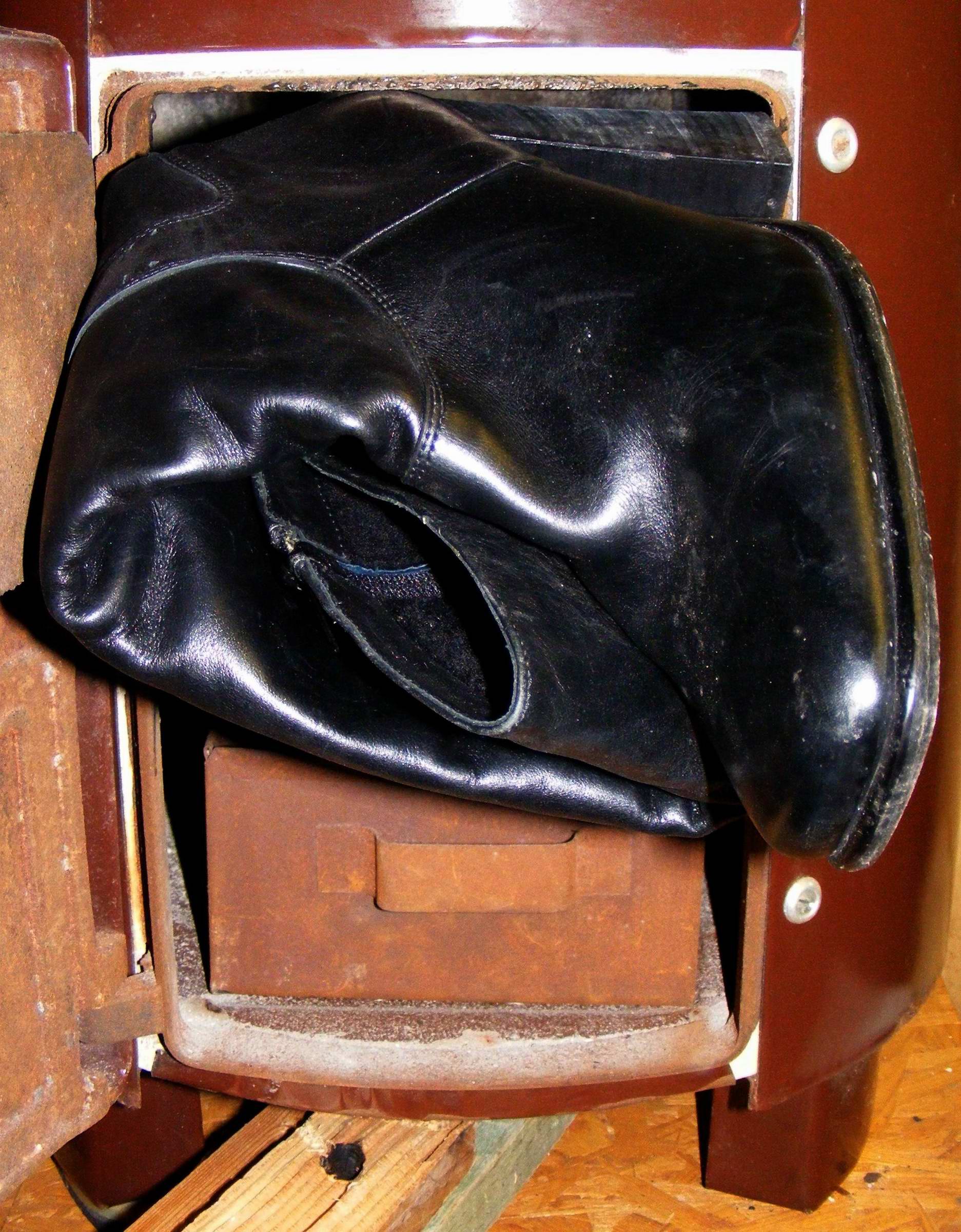 Bilder; alle hier gezeigten Schuhe/Stiefel befinden sich bereits in unmittelbar gefährlicher Nähe des Heizungsofens und warten sehnsüchtig auf ...