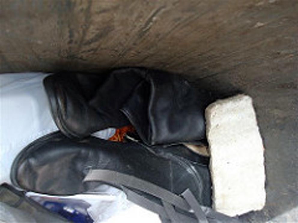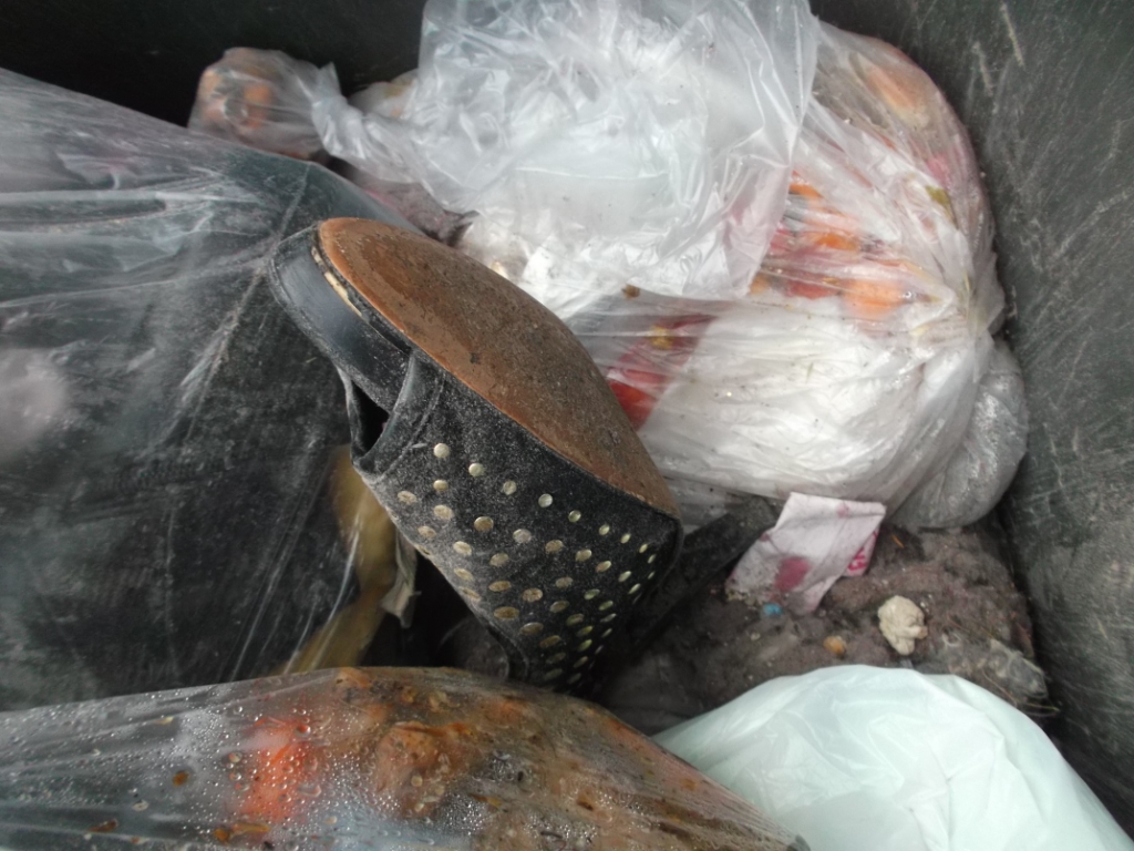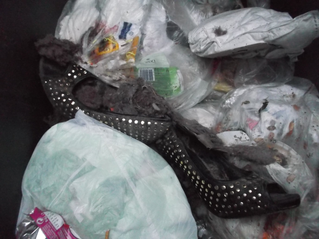 Endlich wieder an der "interessanten" Müllschicht. Erinnert ihr euch noch, dass die eine Schuhspitze des aufragenden Buffalo-Pumps in etwa auf gleicher Höhe wie der Tonnenrand sich befand? Zusammengesackt "nur" durchs Müllgewicht!
