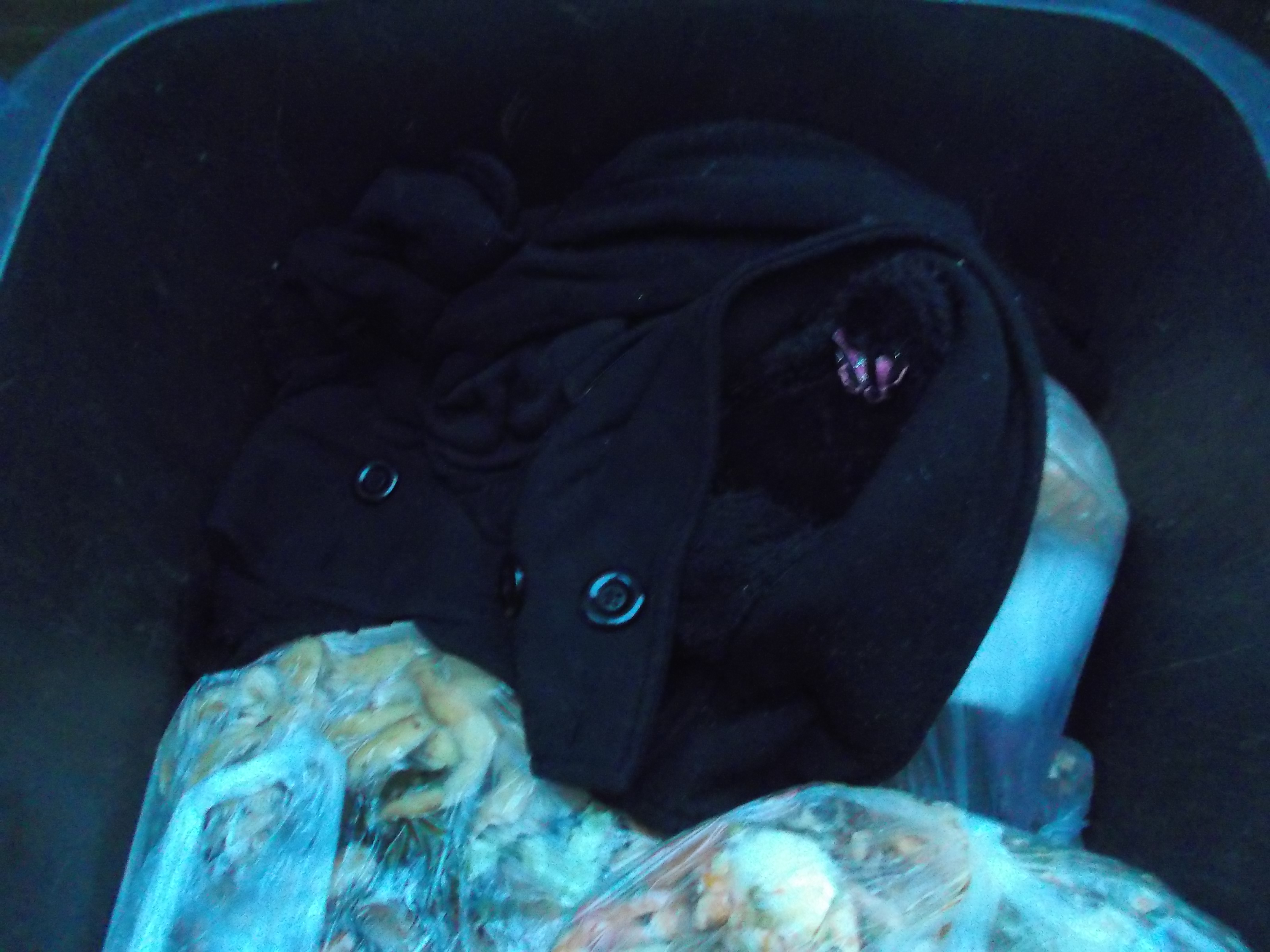 Doch unsere Mülltonne sollte am nächsten Tag schon eine weitere "Attraktion" erhalten: Laura hatte ihre alte Jacke noch zur Mülltonne gebracht. Eigentlich schade drum, aber diese Jacke war schon echt etwas abgetragen und sie hat von diesem Modell eh nicht nur eine. Also die wichtigsten Sachen aus den Taschen ausräumen, die Jacke ausziehen und gleich damit zur Mülltonne laufen, damit die Jacke nicht ewig lang rumliegt und nochmal wertvollen Platz im Kleiderschrank oder an der Garderobe sinnlos verbraucht; - und unsere Mülltonne hatte noch ein "schmutziges Plätzchen" für Lauras abgelegte Lieblingsjacke: :twisted: