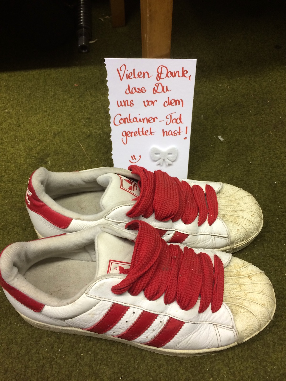 Es lugte auch ein Paar niedlicher Adidas Superstar heraus, mit roten Fat Laces, wie ich es sehr reizvoll finde.